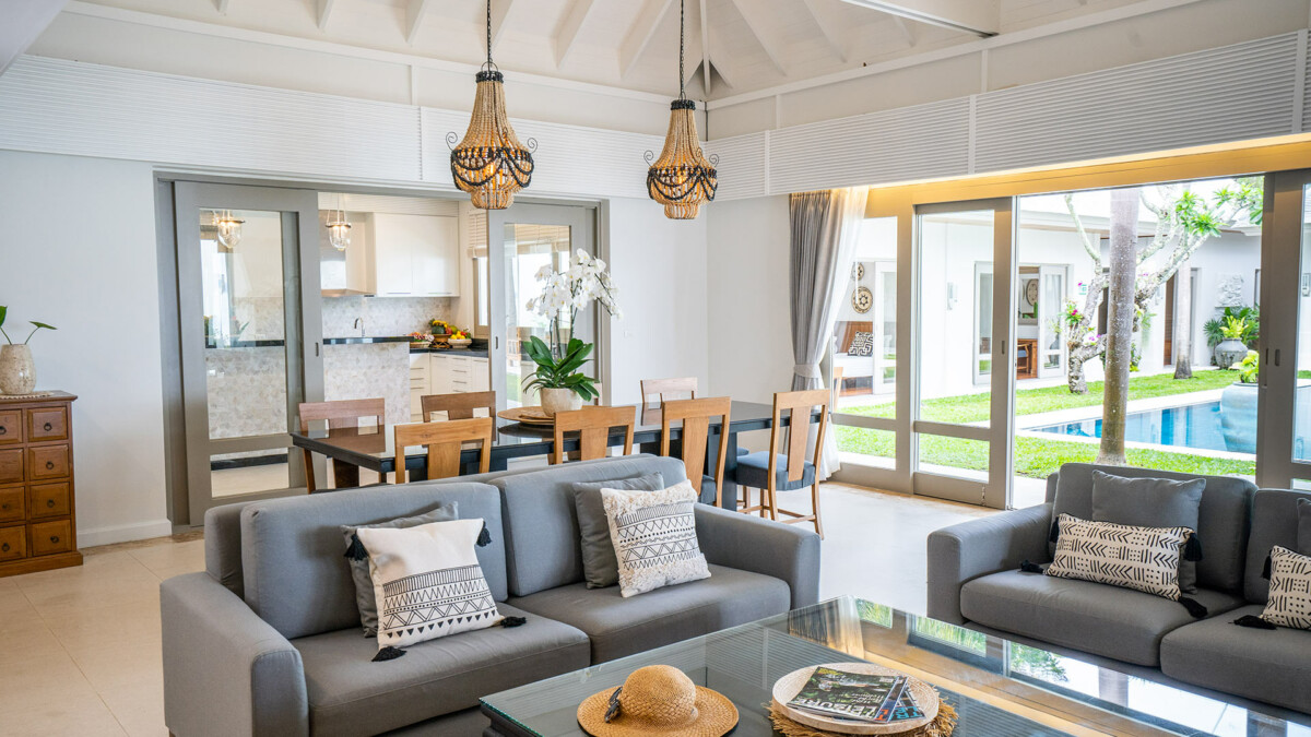 Sur un côté de la villa, vous trouverez un salon avec télévision, une cuisine ouverte entièrement équipée et une première table à manger.