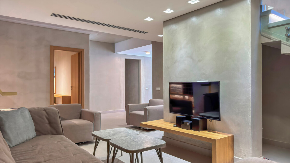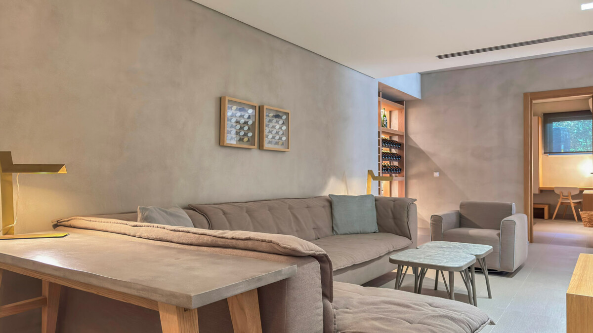 Moderne et minimaliste, cette villa située sur le rivage de Korfalonas présente des lignes épurées, un mobilier de grande qualité et un confort luxueux.