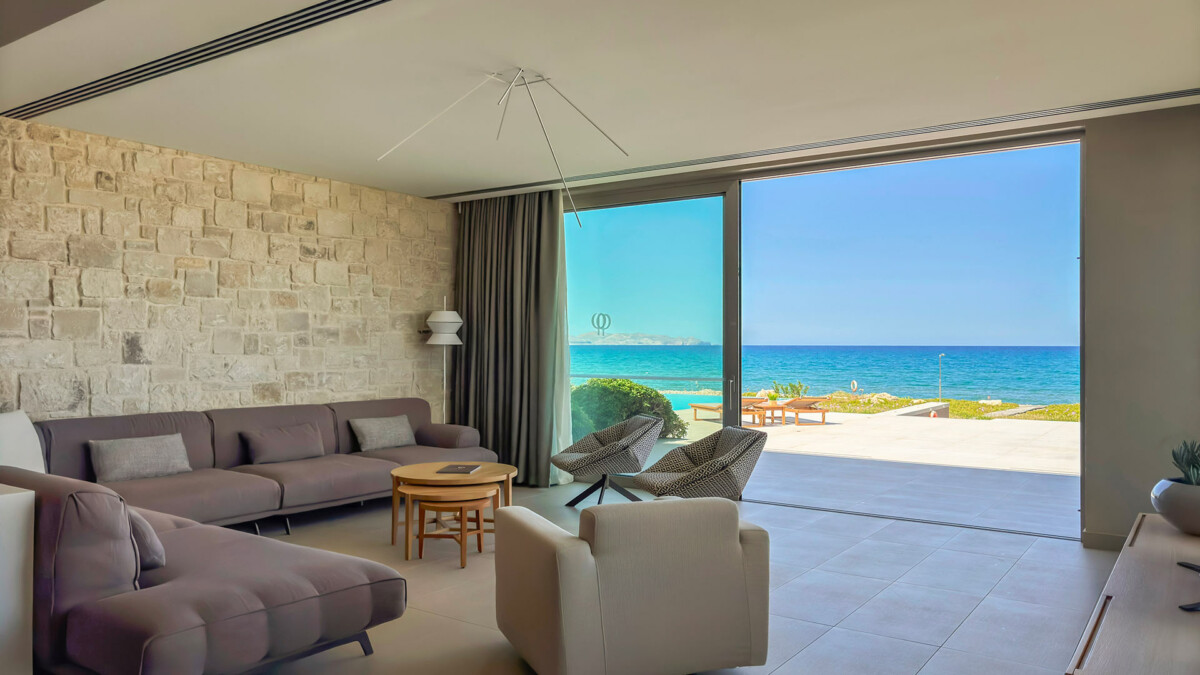 Avec un panorama de 150 mètres en front de mer, le salon bénéficie à lui seul de six mètres de fenêtres qui puise dans la lumière naturelle tout en offrant une vue imprenable sur l’eau.