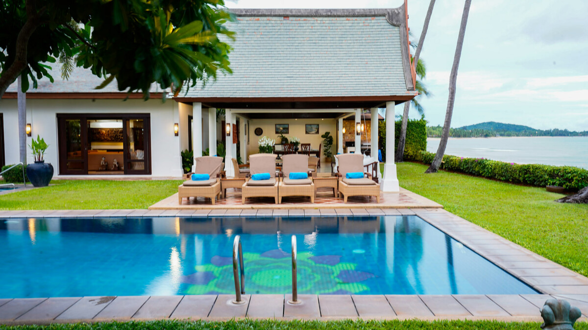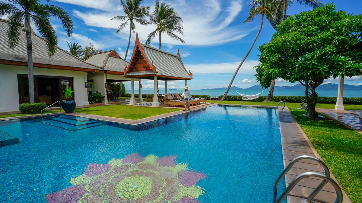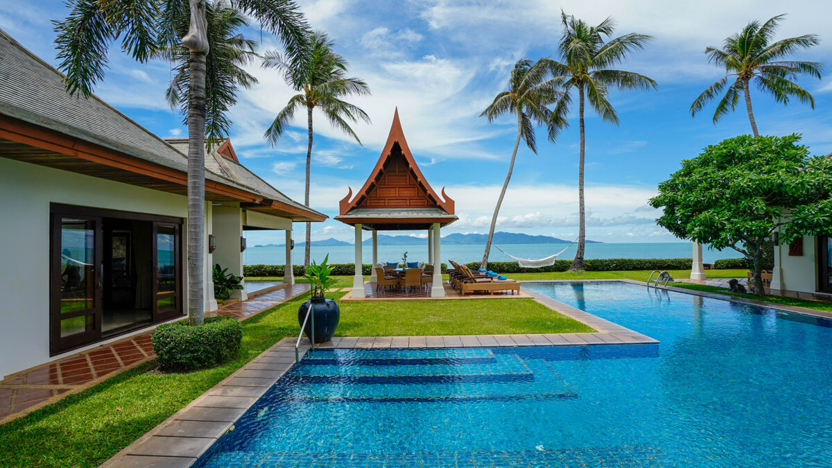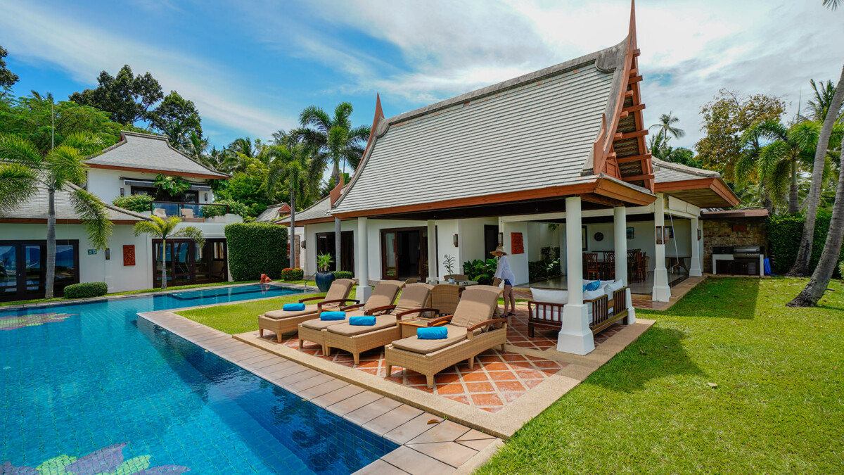 La grande piscine est idéalement située au centre de la villa. Juste à côté, faisant face à la mer, vous trouverez un espace lounge confortable sous une sala thaïlandaise.