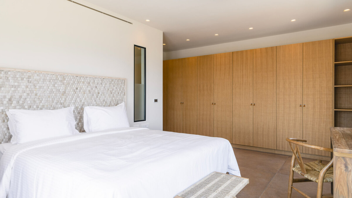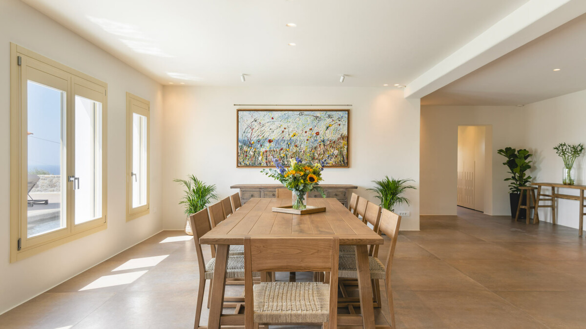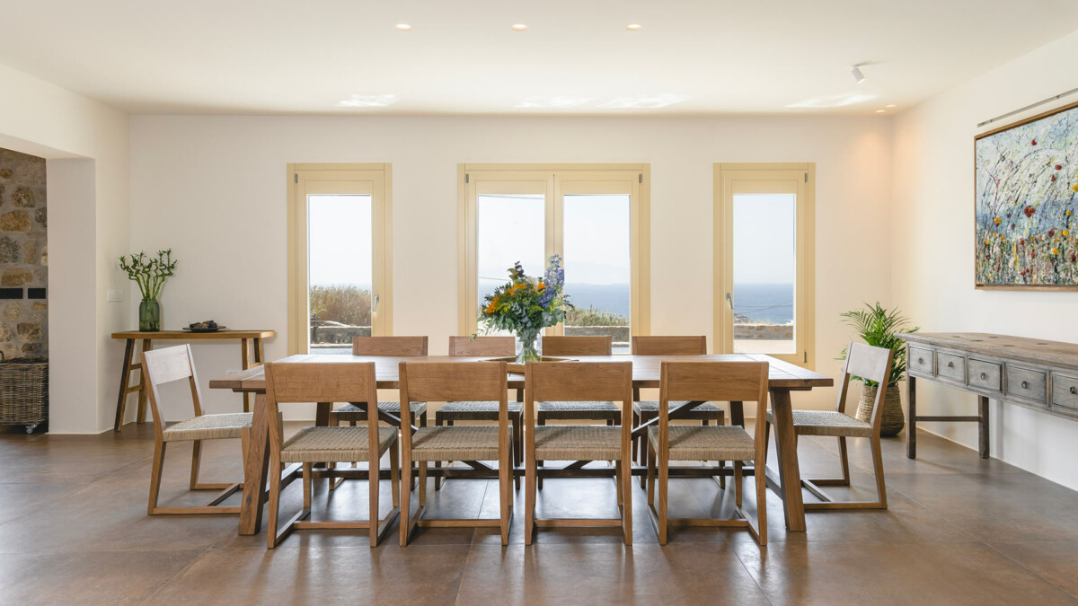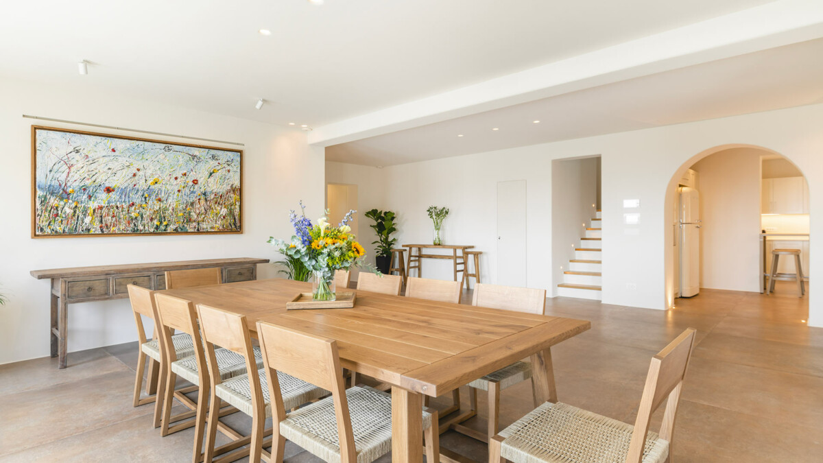 L’intérieur de la villa s’ouvre sur un espace de vie ouvert incluant une cuisine entièrement équipée, promettant de satisfaire les amateurs de cuisine. Le salon (équipé de ventilateurs de plafond pour un confort optimisé), baigné de lumière naturelle, bénéficie d’une vue spectaculaire sur la piscine et la mer. L’espace de repas intérieur, qui peut accueillir jusqu’à huit convives, sert de transition parfaite vers l’extérieur.