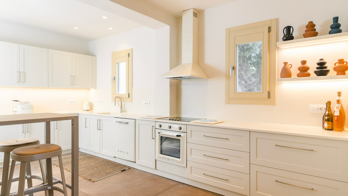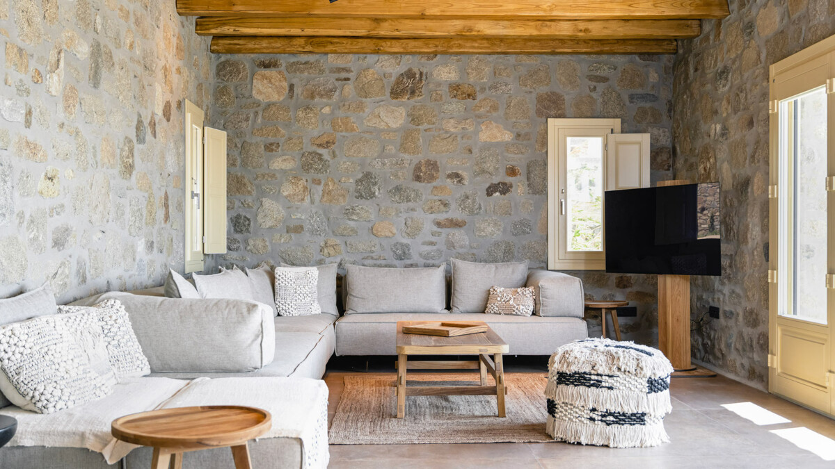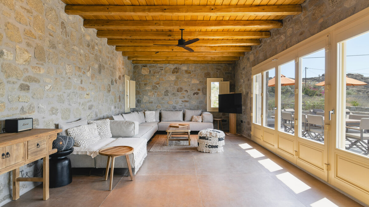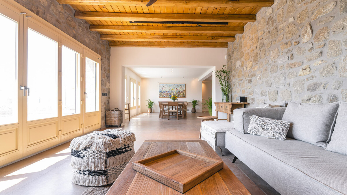 L’intérieur de la villa s’ouvre sur un espace de vie ouvert incluant une cuisine entièrement équipée, promettant de satisfaire les amateurs de cuisine. Le salon (équipé de ventilateurs de plafond pour un confort optimisé), baigné de lumière naturelle, bénéficie d’une vue spectaculaire sur la piscine et la mer. L’espace de repas intérieur, qui peut accueillir jusqu’à huit convives, sert de transition parfaite vers l’extérieur.