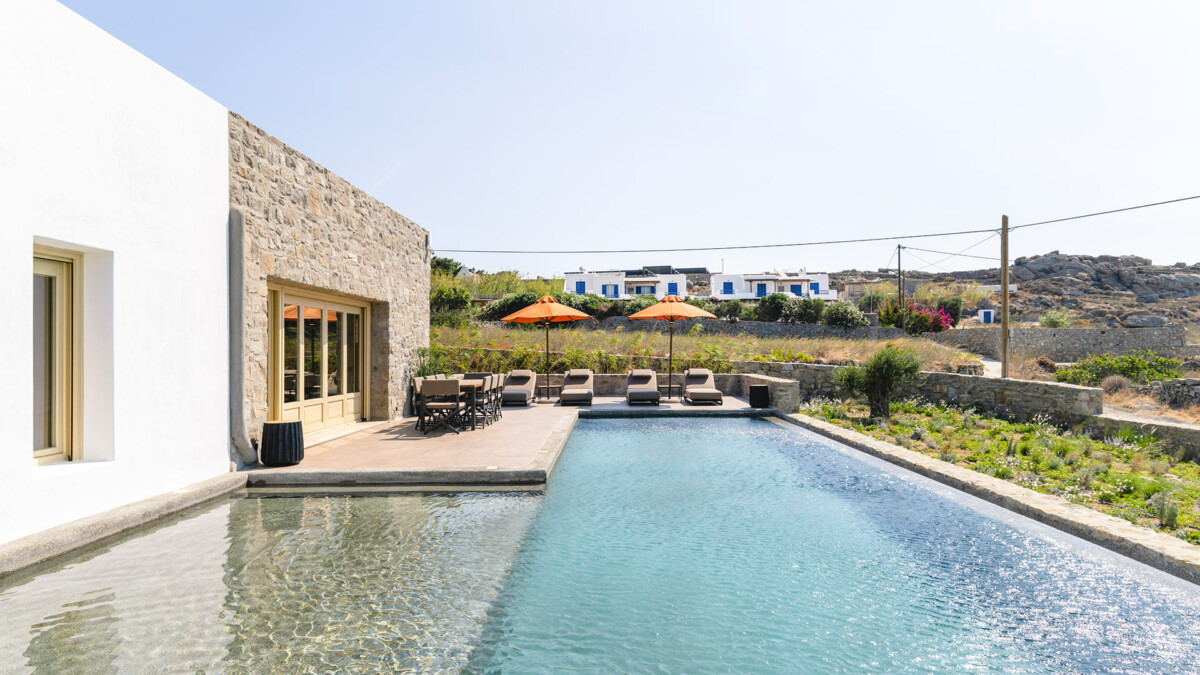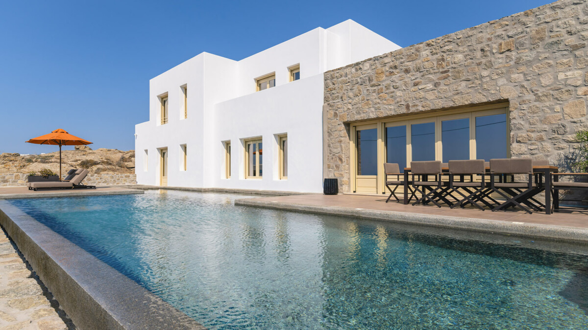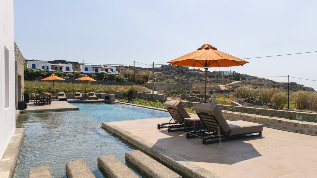 L’extérieur de la villa est tout aussi impressionnant que l’intérieur avec sa piscine à débordement (pouvant être chauffée) de 80 m², où l’on peut se prélasser sur les chaises longues sous les parasols, entouré par la beauté naturelle de Mykonos. L’espace repas extérieure, avec sa capacité d’accueil de huit personnes, permet de savourer de délicieux repas en profitant de la vue sur la mer, tandis que la douche extérieure offre un rafraîchissement bienvenu sous le soleil méditerranéen.