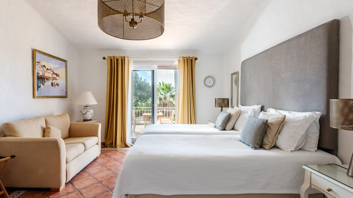 Chambre. La chambre propose 2 lits jumeaux transformables en lit double. Salle de bain privée. WC dans la salle de bain. La chambre inclut également : climatisation, salon, terrasse privée.
