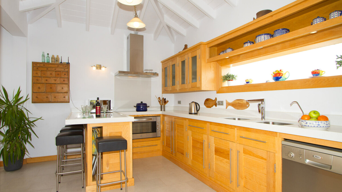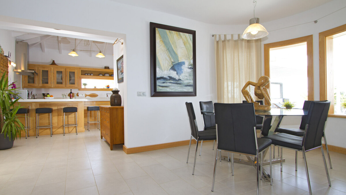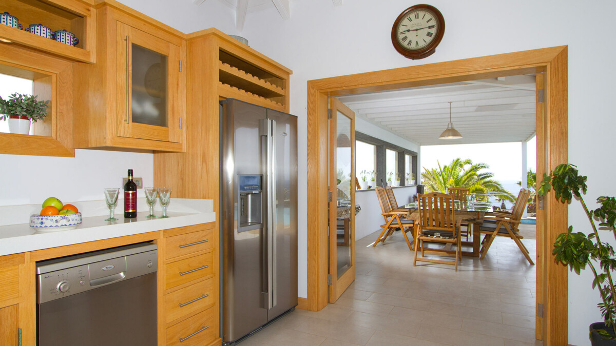 Cette villa offre de spacieux espaces de vie et une salle à manger décloisonnés et de grandes baies vitrées s’ouvrant sur la terrasse ombragée offrant de magnifiques vues sur la mer. Pour les clients qui cherchent à cuisiner, vous pouvez profiter d’une cuisine sur mesure moderne entièrement équipée pour tous vos besoins : four / plaques de cuisson / grill, lave-vaisselle, réfrigérateur, congélateur et micro-ondes.