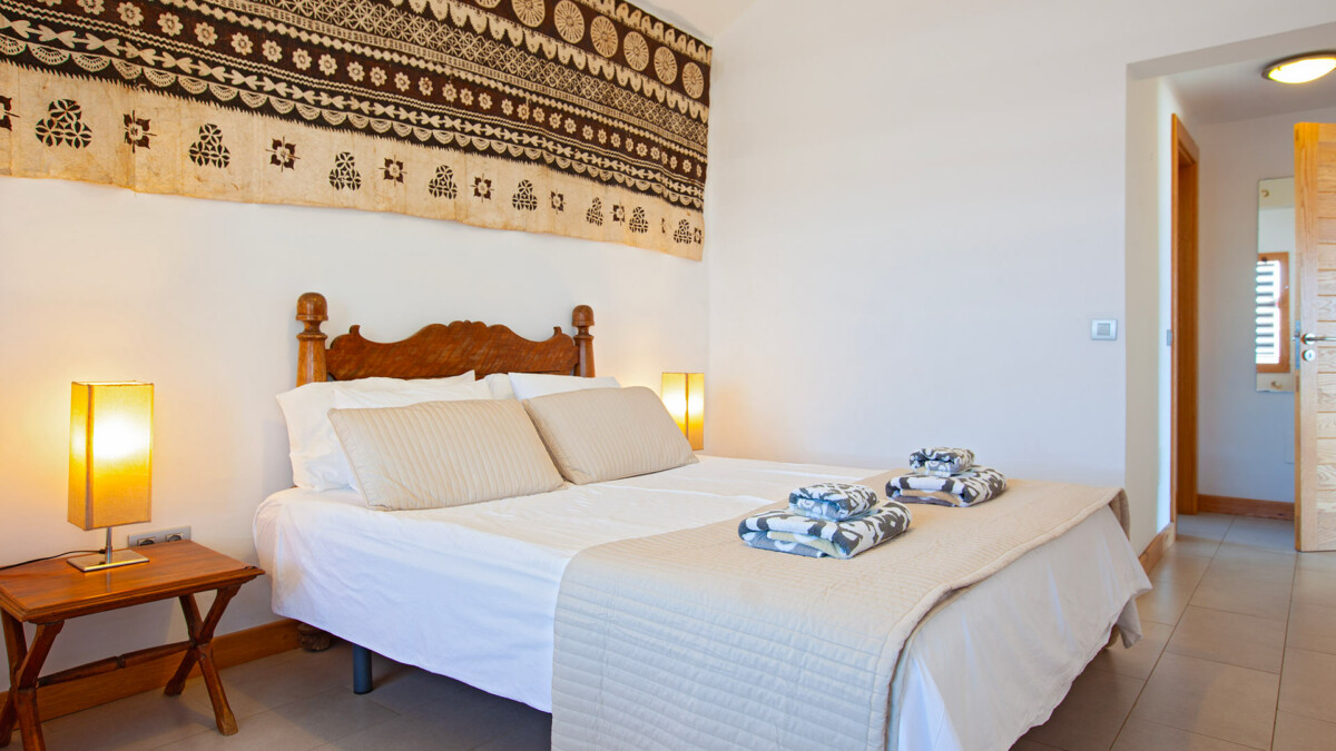 La suite principale dispose de portes-fenêtres donnant sur la terrasse ombragée, d’un lit double king-size, d’une armoire intégrée et d’une salle de bain avec lavabo et sèche-cheveux.