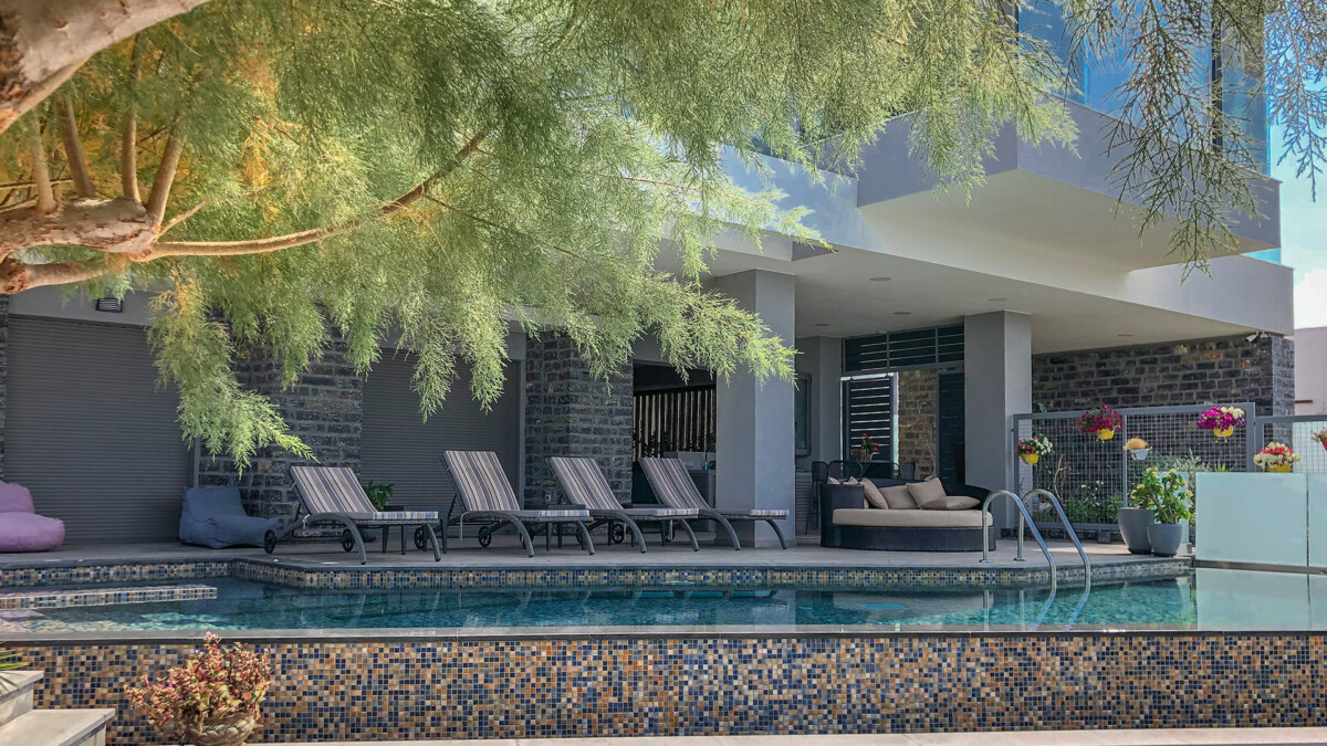 La villa dispose d’un coin repas extérieur composé de plusieurs tables sur une terrasse couverte au fond de la piscine.