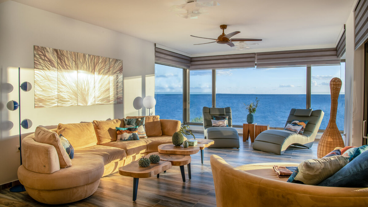 L’une des chambres en front de mer a des portes menant aux vérandas avant, à la piscine et au bain à remous extérieur.