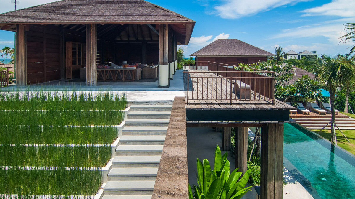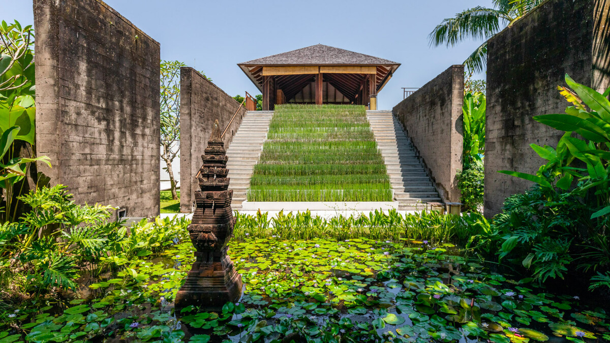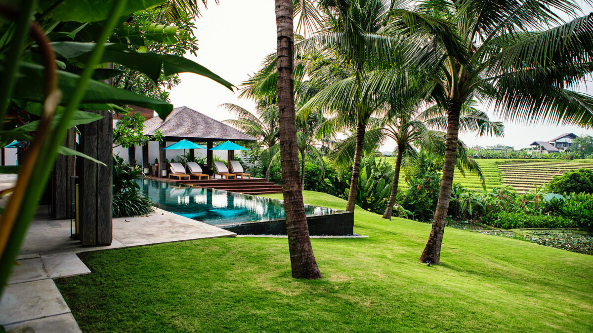 Les extérieurs sont remarquables, avec des pelouses impeccables, des étangs de nénuphars et de lotus, et une micro-forêt unique comportant 100 espèces d’arbres indigènes et une multitude d’arbustes et de fleurs. Une grande terrasse ensoleillée mène à une piscine à débordement (25 x 5m, profondeur 1.4m), idéale pour se détendre tout en admirant les rizières environnantes. Chaque villa invitée possède sa propre terrasse extérieure privée et un point d’eau pour un espace de relaxation personnel.