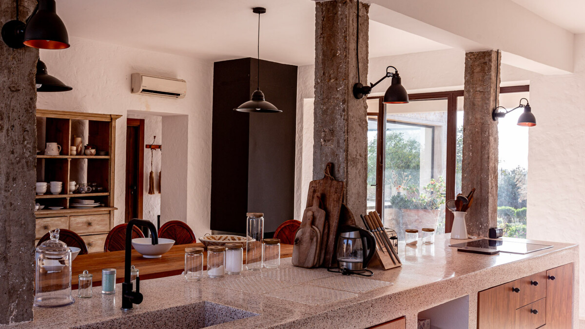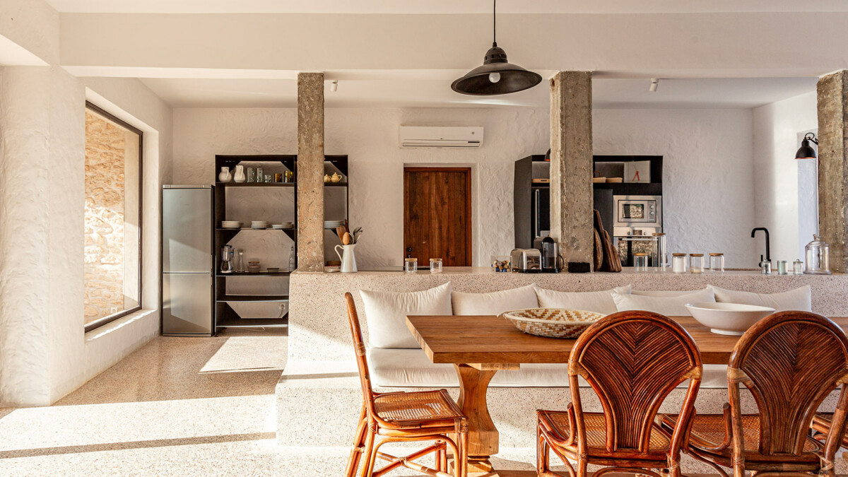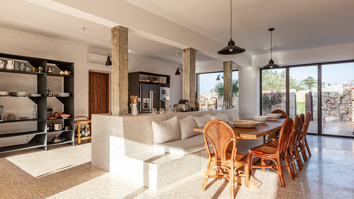 L’intérieur respire la sérénité grâce à son style épuré. Les architectes ont opté pour des murs en ciment jeté blanc et des sols en granito beige, créant une toile de fond neutre et apaisante. La cuisine et les banquettes du salon, construites en maçonnerie, suivent cette même lignée esthétique avec un revêtement en granito.