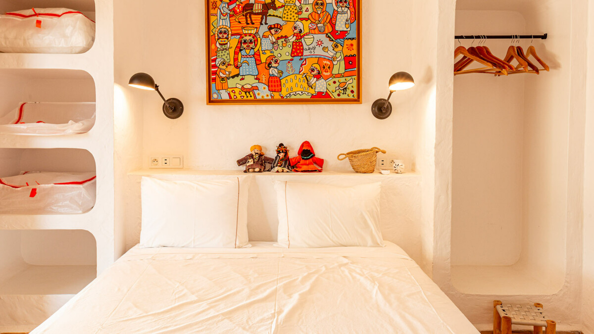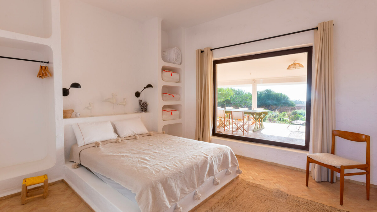 Les chambres se distinguent par leur simplicité et leur fonctionnalité, avec des murs également en ciment jeté blanc et des salles de bains en tadelakt beige. La luminosité est au rendez-vous grâce aux grandes fenêtres et aux baies vitrées, ouvrant les espaces vers l’extérieur.