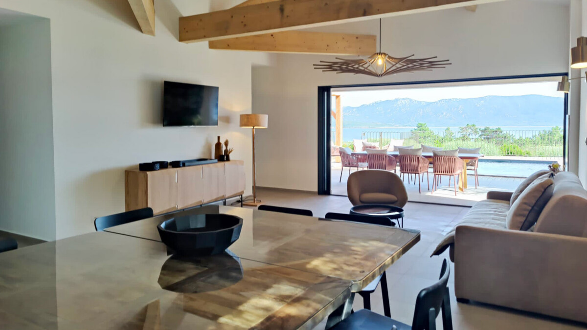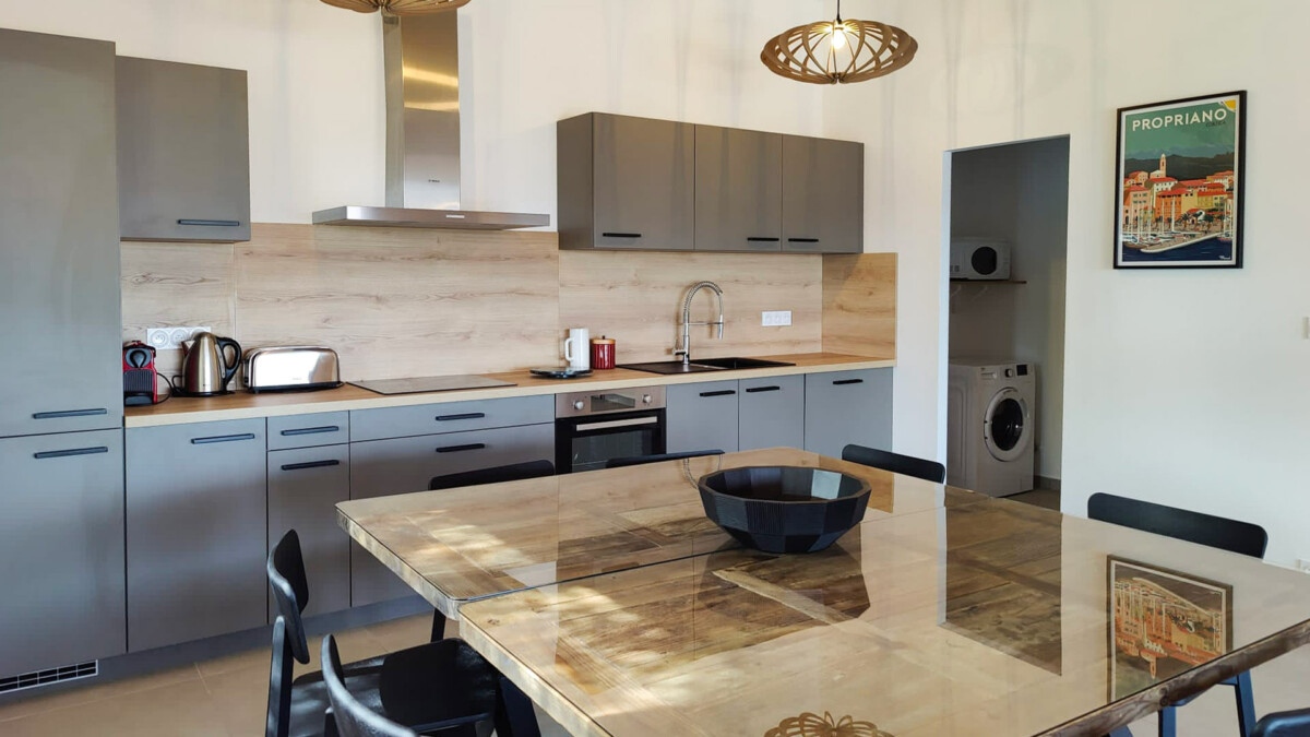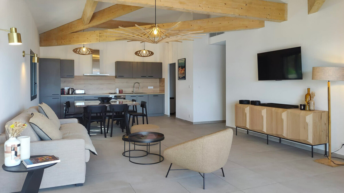 La cuisine américaine, ouverte sur un vaste salon/salle à manger, est un espace convivial où vous pourrez préparer de délicieux repas en famille ou entre amis. La décoration raffinée, associée au style contemporain des meubles, crée une atmosphère moderne et accueillante pour vos prochaines vacances.