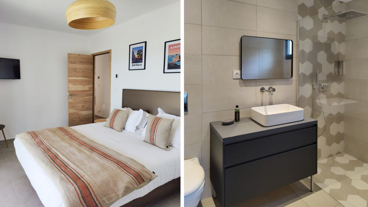 Chambre, Rez-de-chaussée. La chambre propose 1 lit double 160 cm. Salle de bain partagée, avec douche. WC partagés. La chambre inclut également : climatisation.