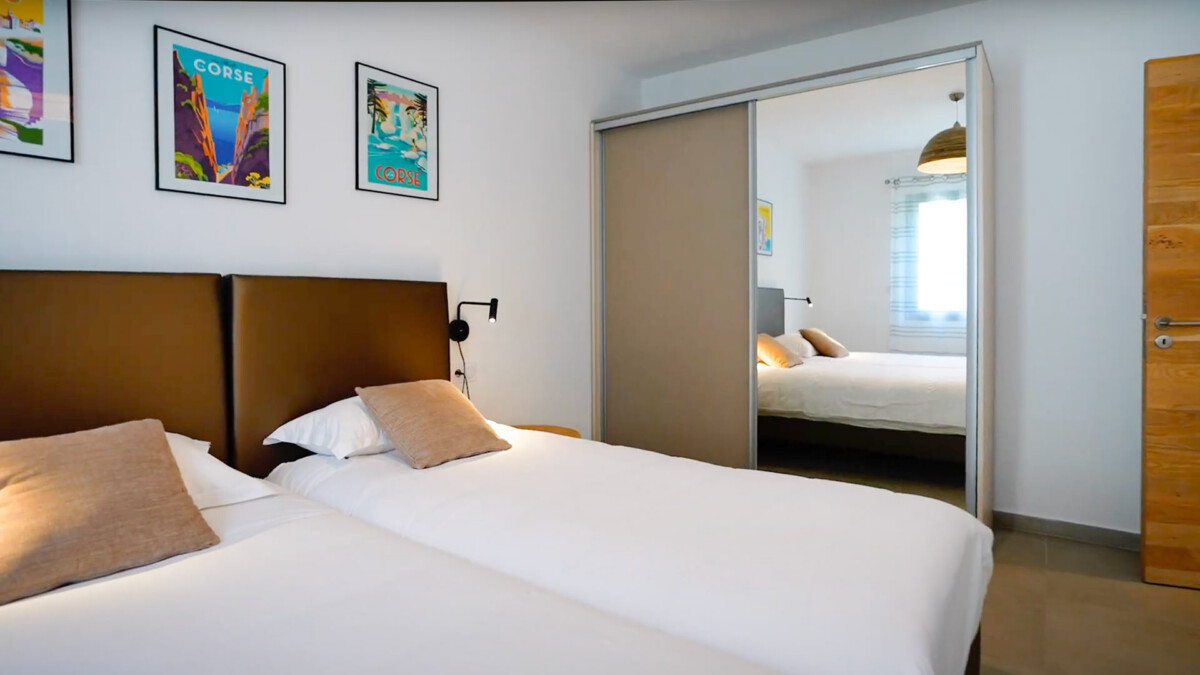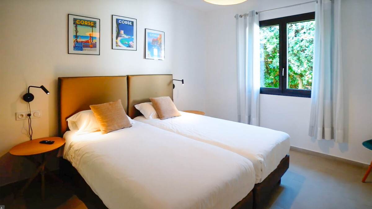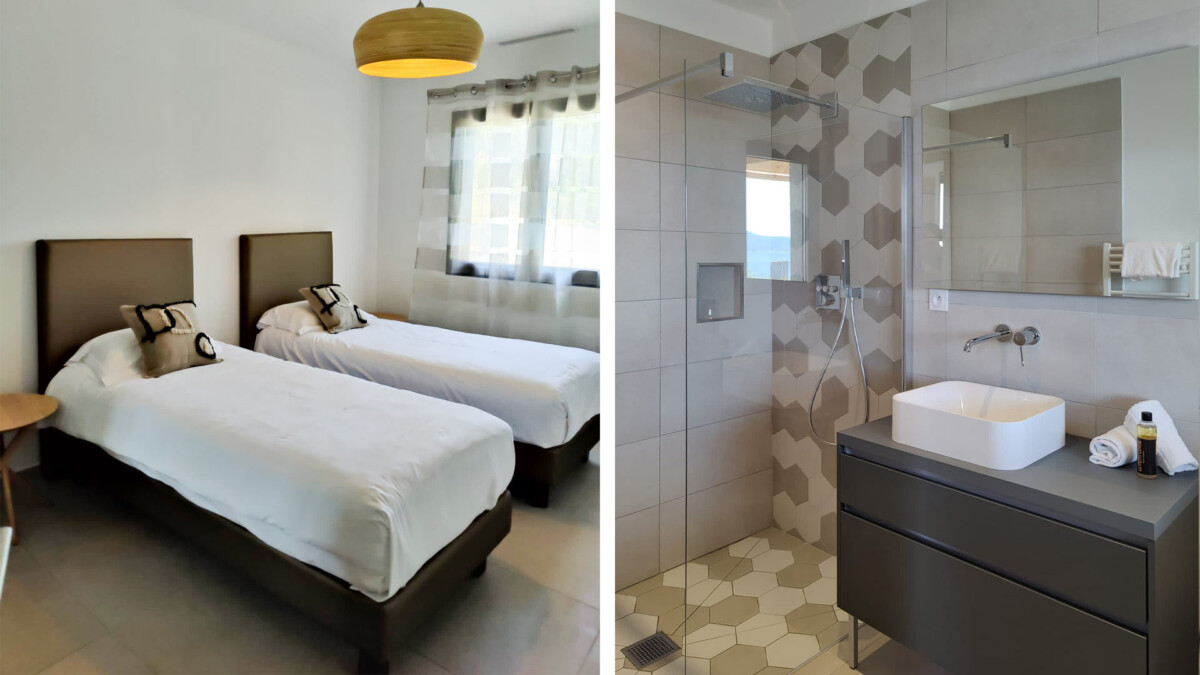 Chambre, Rez-de-chaussée. La chambre propose 2 lits jumeaux. Salle de bain partagée, avec douche. WC partagés. La chambre inclut également : climatisation.