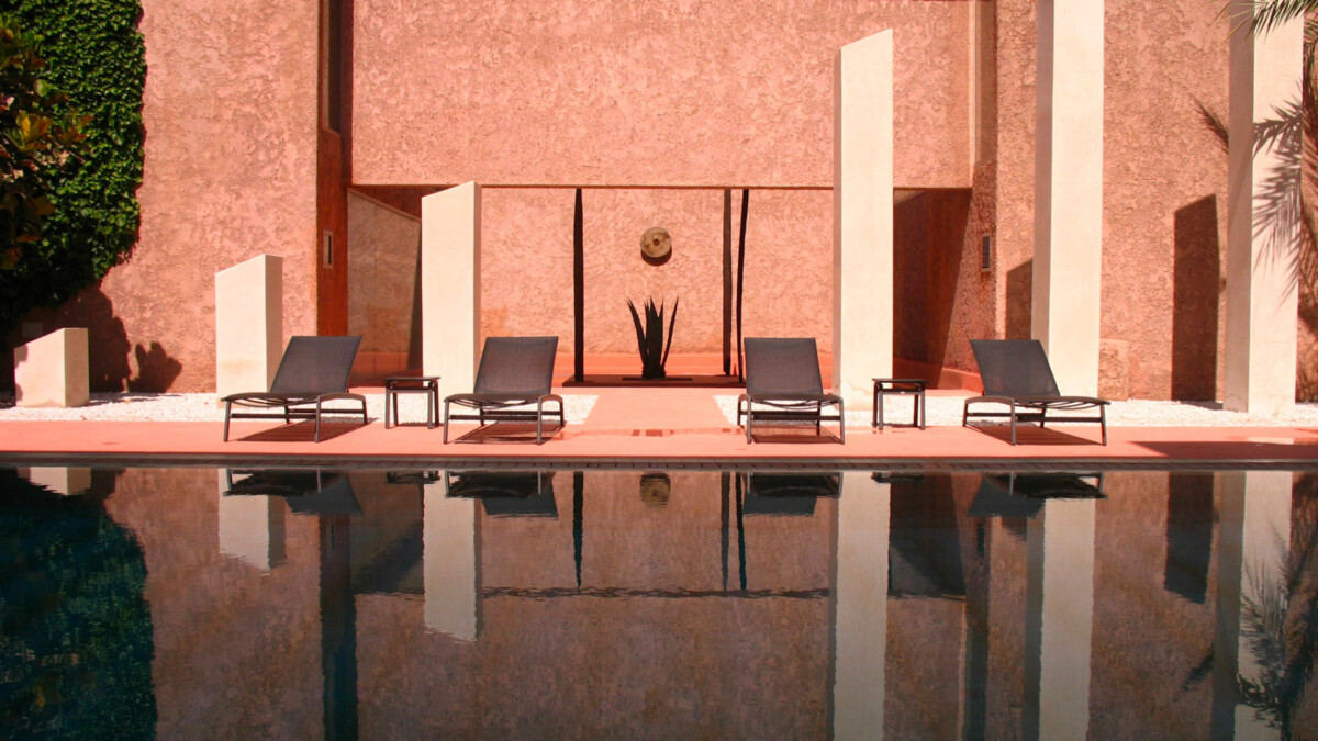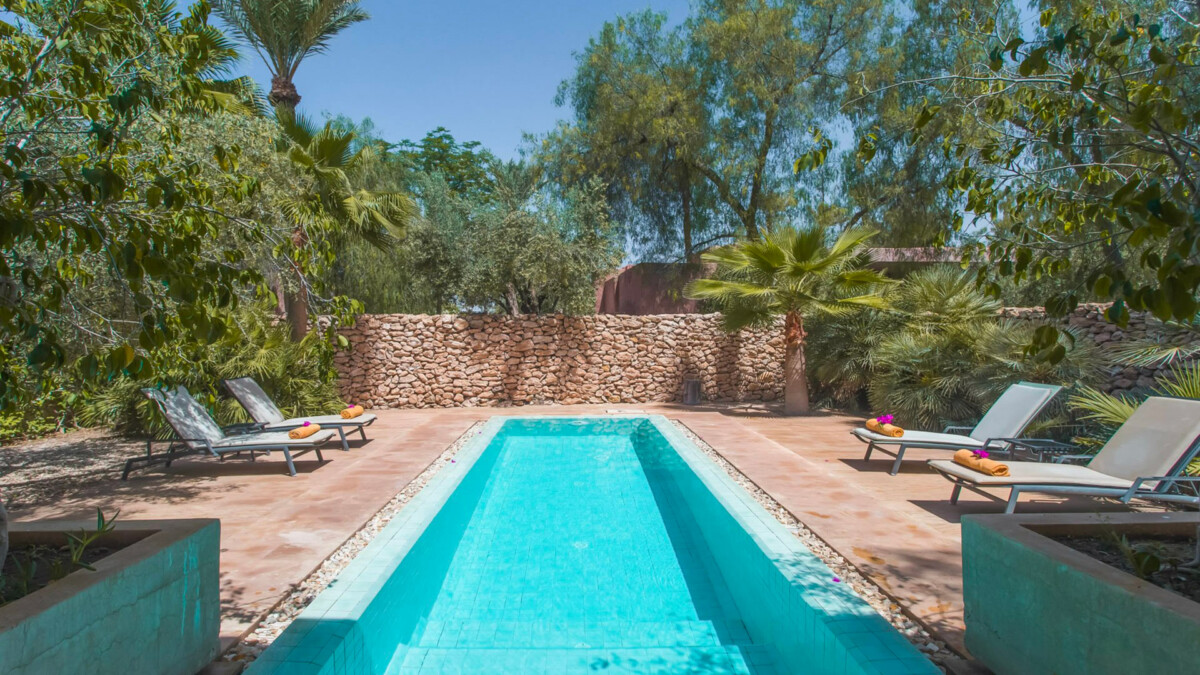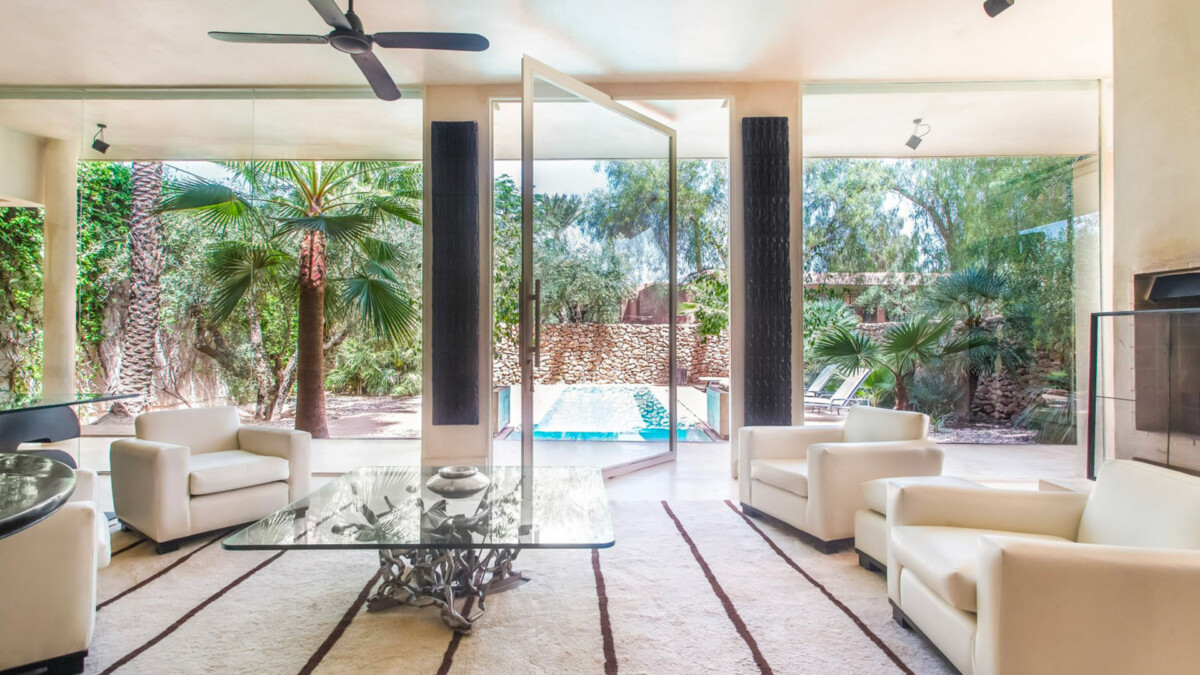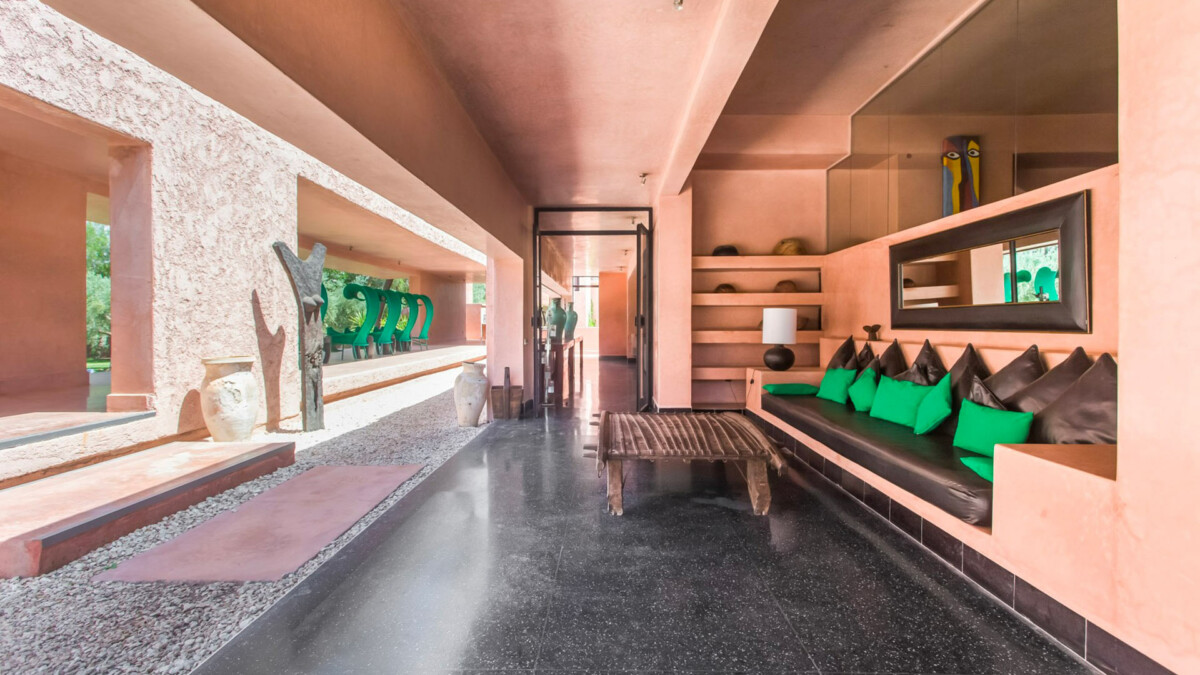 En plein cœur de la Palmeraie au douar Abiad, à proximité des 3 golfs et à 10 minutes du centre de Marrakech, la propriété est un oasis de paix et de verdure de 2 ha de jardins paysagés plantés d’oliviers et de palmiers et exposant de belles sculptures contemporaines.