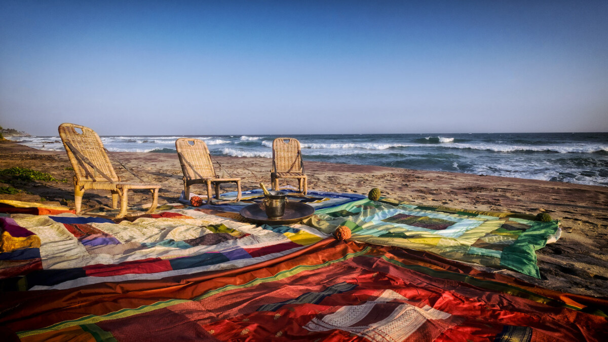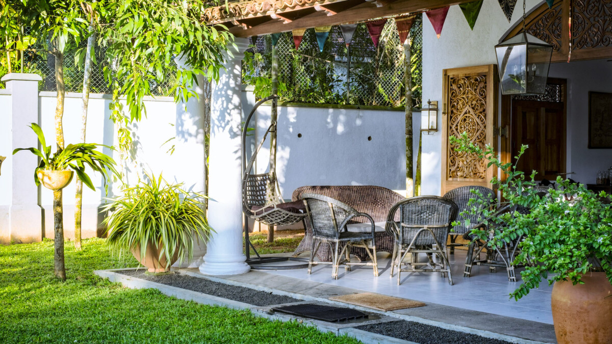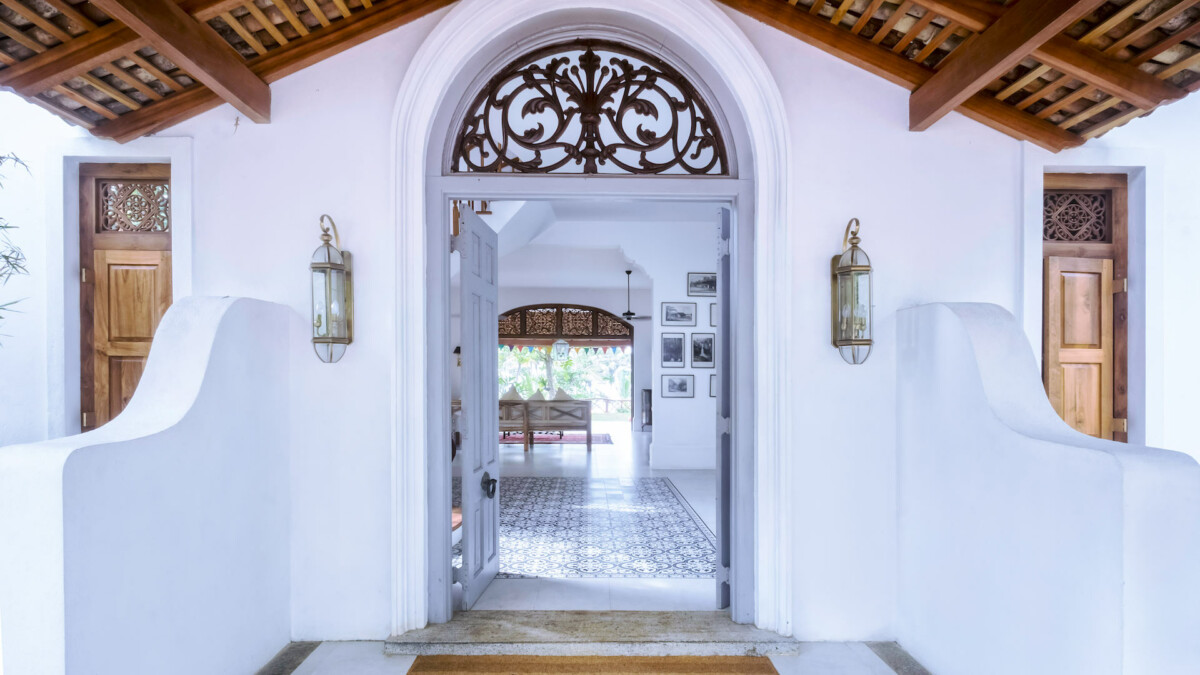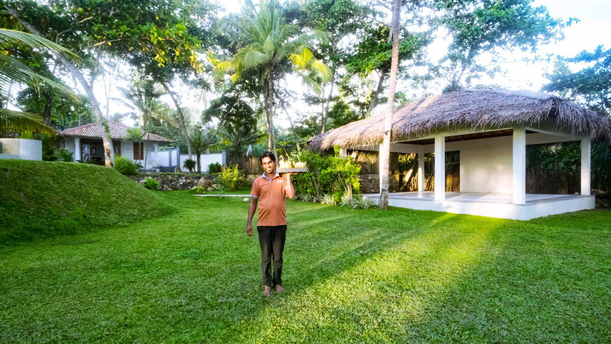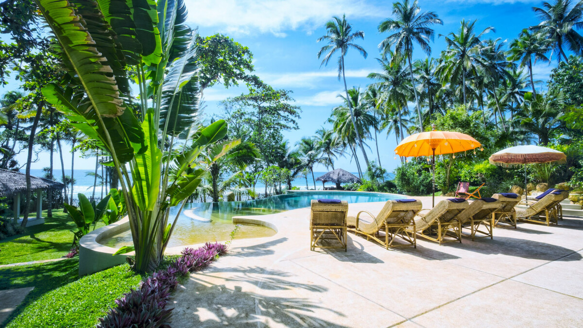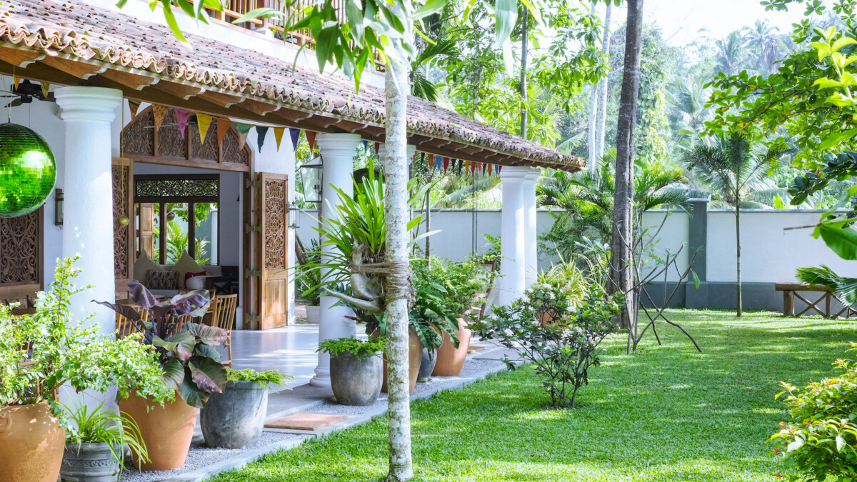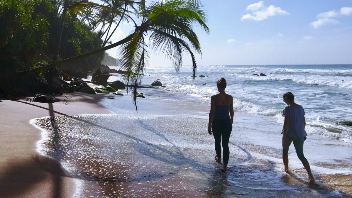 Le portail au fond du jardin mène jusqu’à la remarquable plage de sable jaune, noir et rouge.