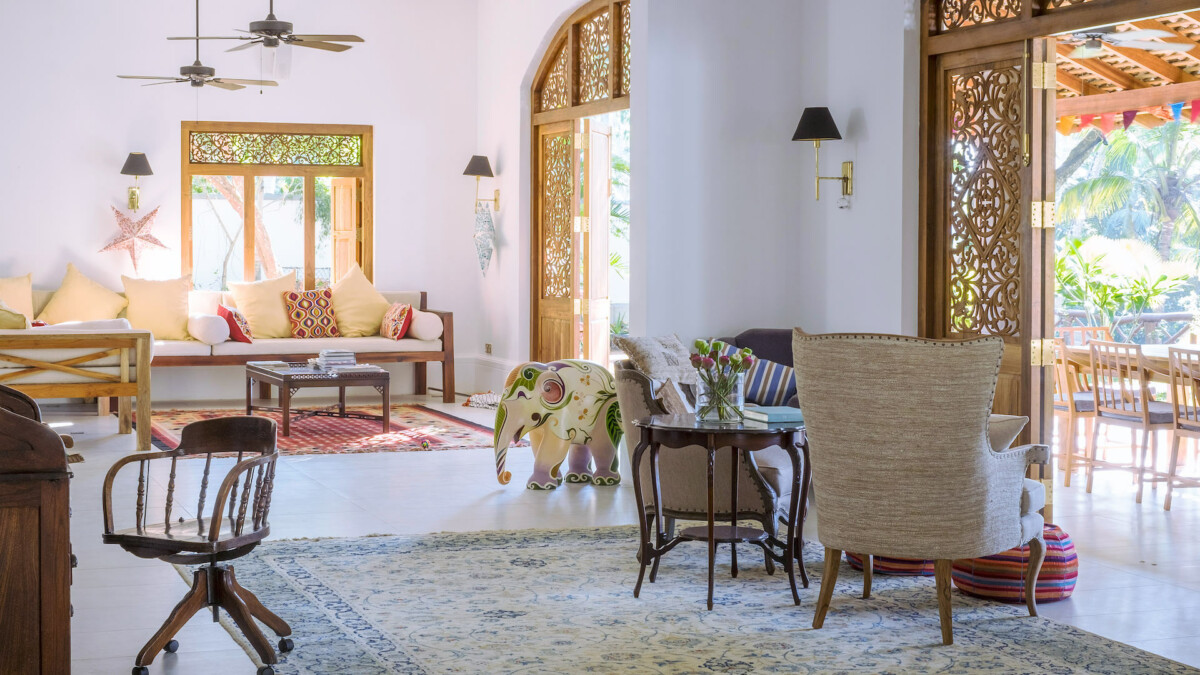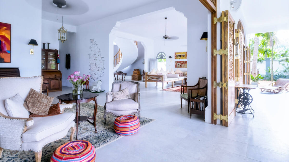 Coin salon : Plan ouvert. Grands canapés. Coussins