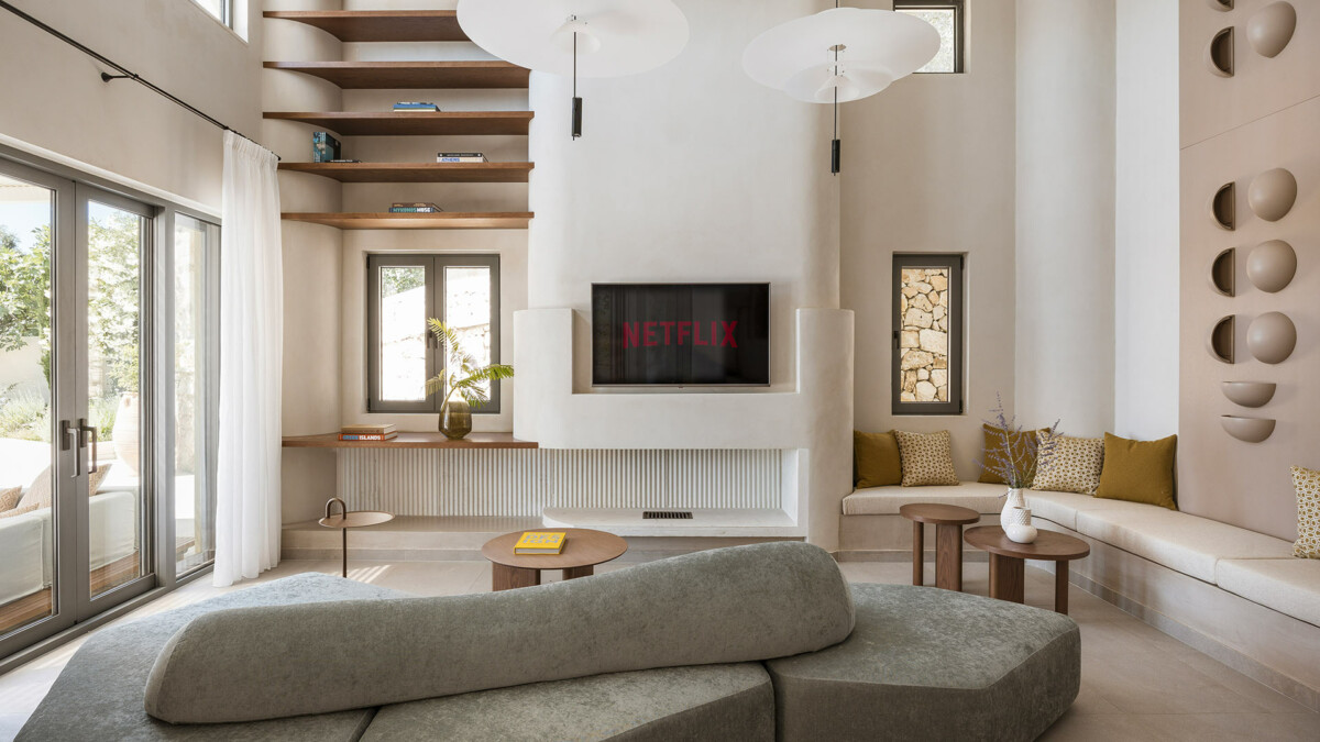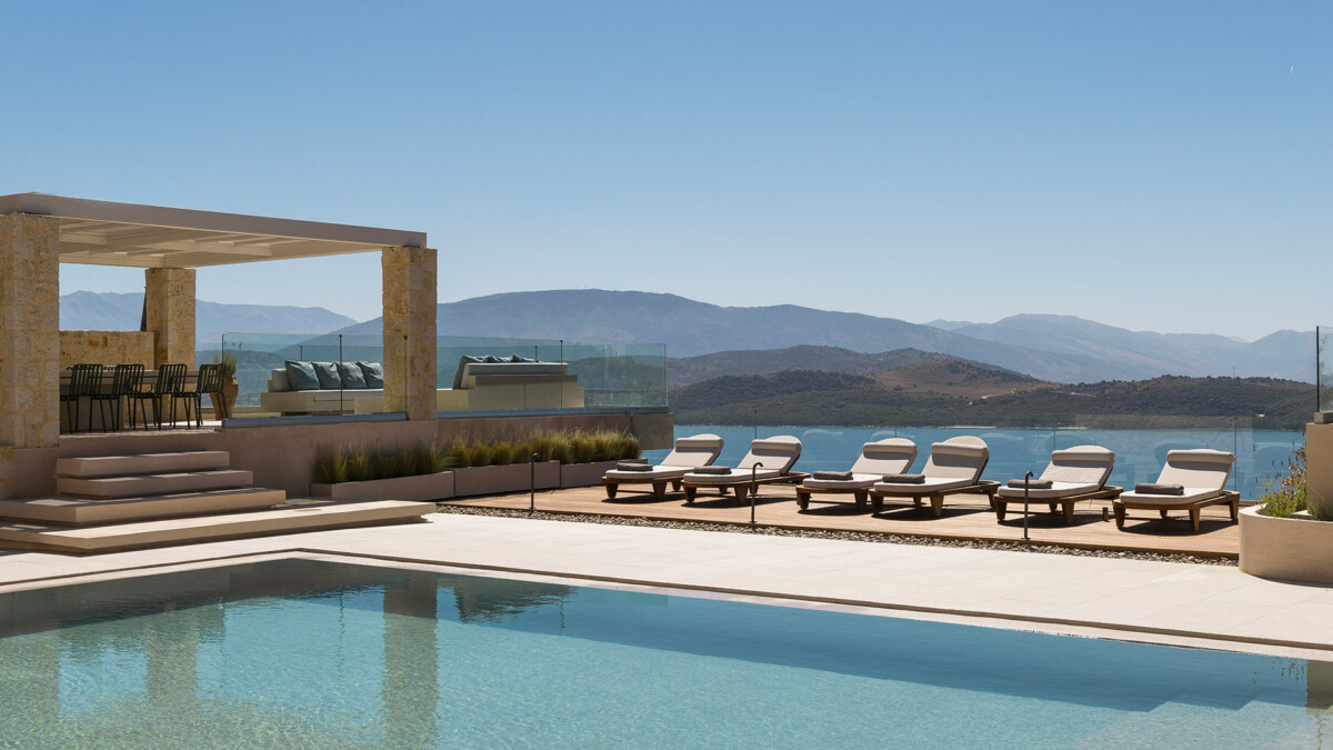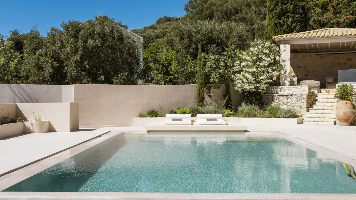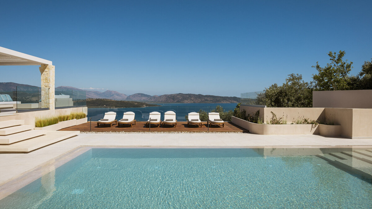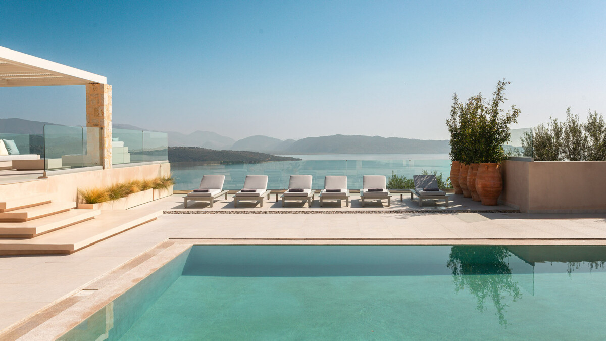 La villa dispose de terrasses confortables et très bien équipées, parfaites pour la vie en plein air. Les aménagements extérieurs comprennent un grand salon, deux espaces repas/salon ombragés et une jolie piscine avec escalier intégré (5,85 x 10,30 m – chauffée sur demande moyennant un supplément), le tout avec des vues imprenables sur la mer et le port d’Agios Stefanos.