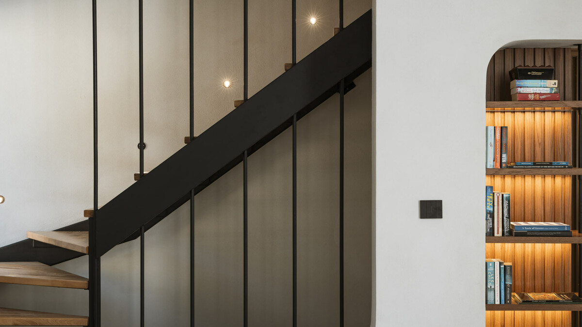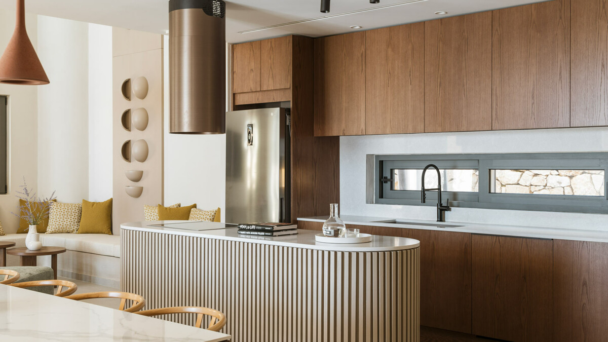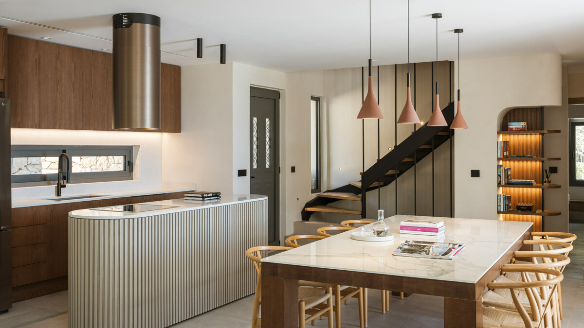 La partie de la maison qui fait face à la mer dispose de grandes portes coulissantes qui relient harmonieusement les pièces au paysage marin et permettent aux intérieurs de bénéficier d’une agréable lumière naturelle.