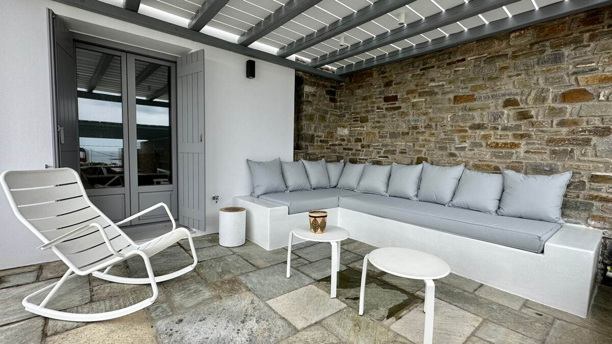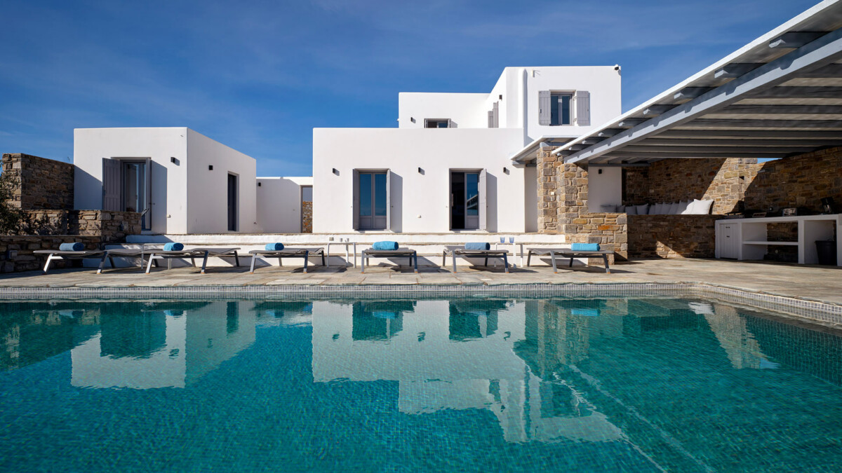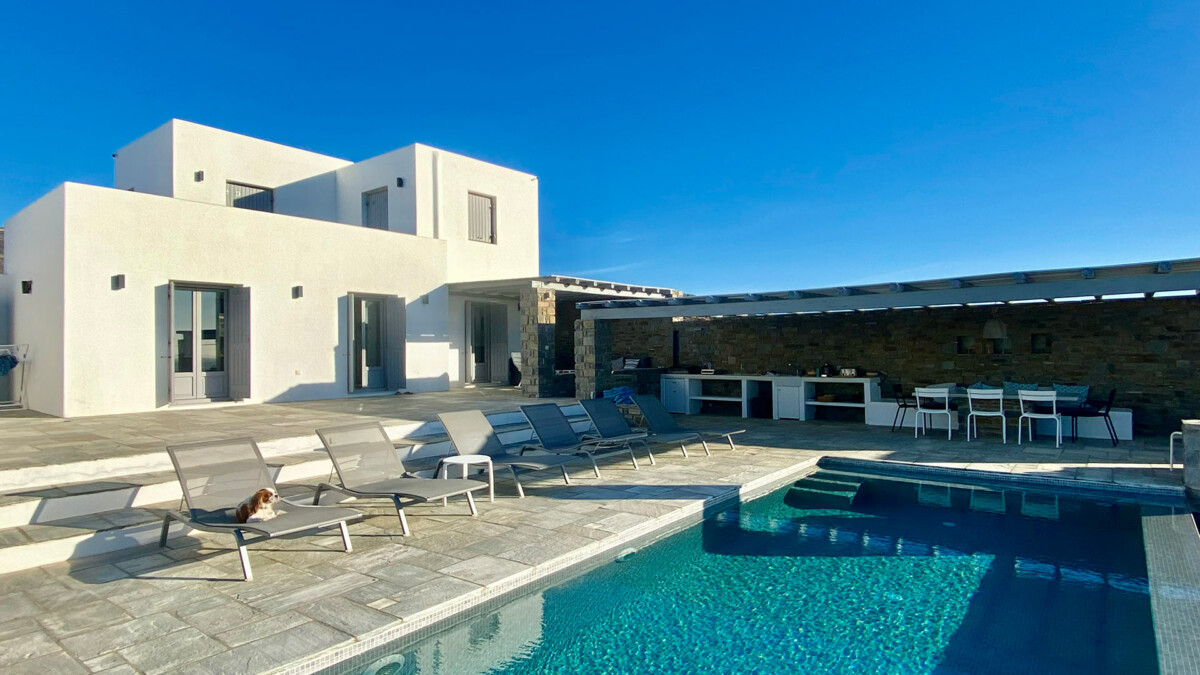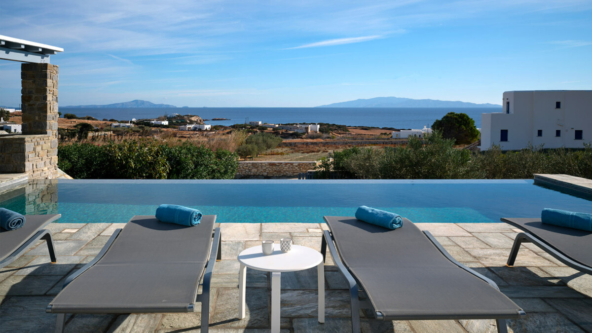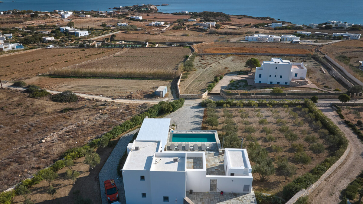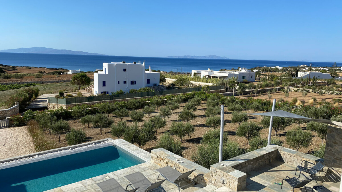 Le véritable charme de cette villa réside dans ses extérieurs. La piscine à débordement (11x6m; profondeur : 1,6m), bordée de transats, offre une vue panoramique sur la mer. Les terrasses ensoleillées et leur mobilier élégant promettent des moments de détente inoubliables sous le ciel bleu des Cyclades. Le jardin d’oliviers et les parterres de plantes locales ajoutent une touche de sérénité, faisant de cet espace un véritable havre de paix.