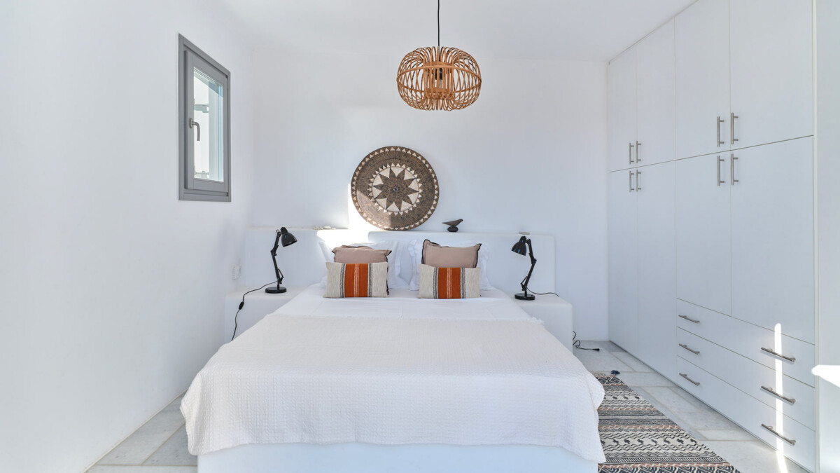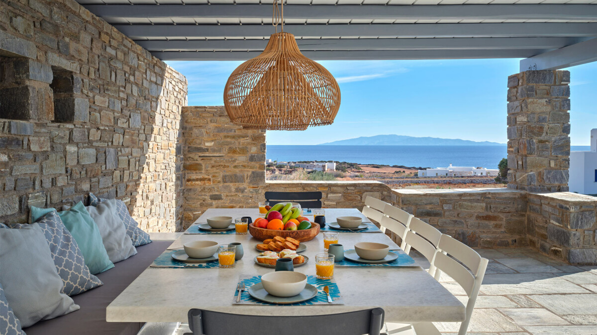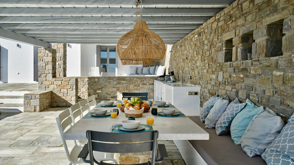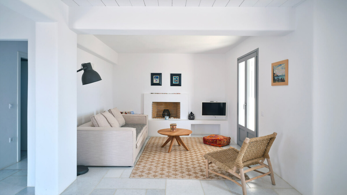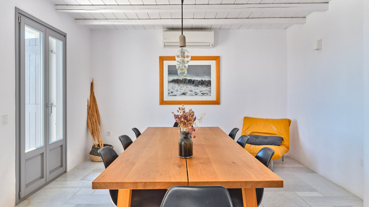 Les intérieurs de la villa allient confort moderne et élégance cycladique. Le rez-de-chaussée s’ouvre sur un grand salon avec cheminée, parfait pour se détendre après une journée de plage. Une cuisine moderne entièrement équipée avec des appareils de qualité, dont un réfrigérateur, une machine à café Nespresso, et un lave-vaisselle, simplifie la préparation de repas conviviaux. Adjacent à la cuisine, la salle à manger spacieuse invite à de mémorables dîners en famille ou entre amis.