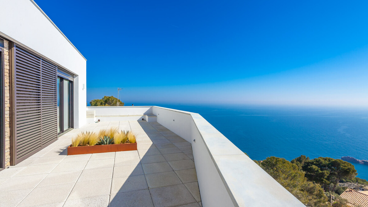 Au rez-de-chaussée il y a un garage pour 2 voitures. Au premier étage, il y a une piscine extérieure (8x4m) avec un très beau jardin et une vue magnifique sur la mer. Aux deuxième et troisième étages, toutes les chambres ont un accès direct aux terrasses avec des vues panoramiques fascinantes.