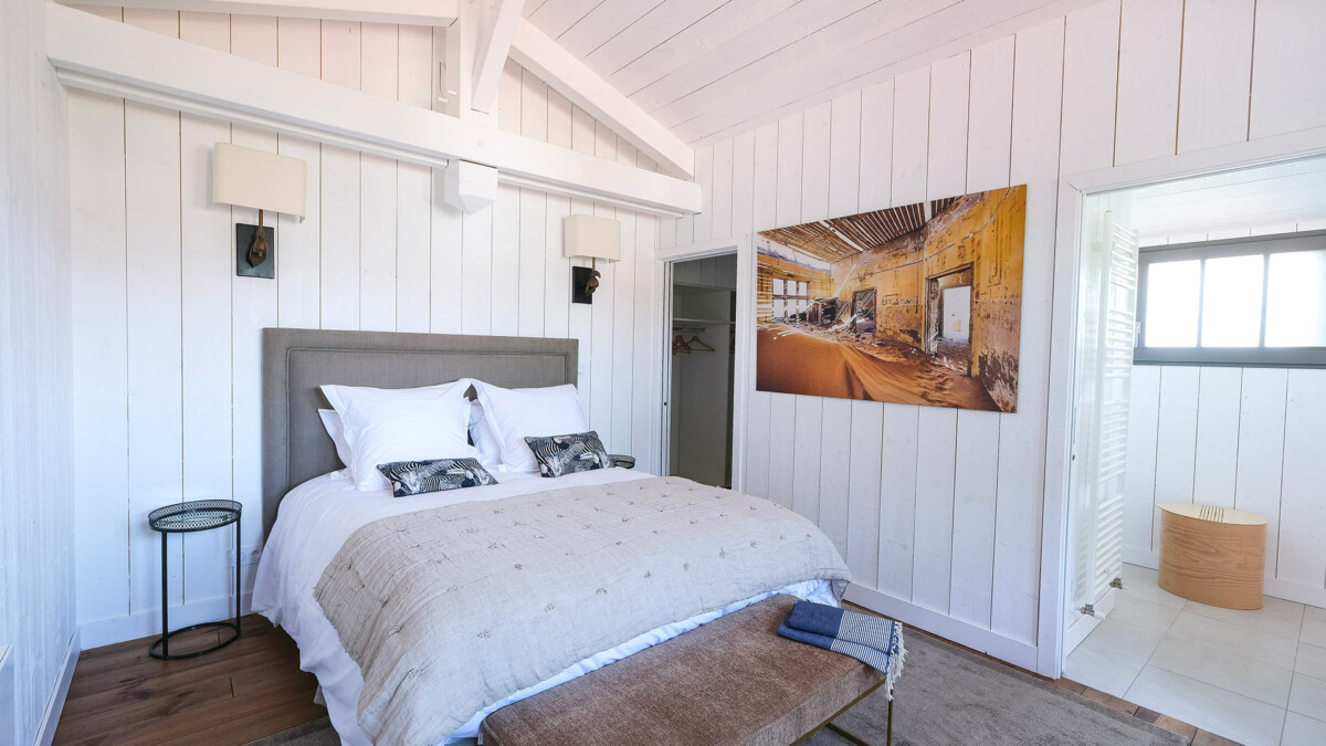 Chambre, 1er étage, vue jardin. La chambre propose 1 lit double 180 cm. Salle de bain privée, avec douche. WC dans la salle de bain. La chambre inclut également : climatisation, dressing, terrasse privée.
