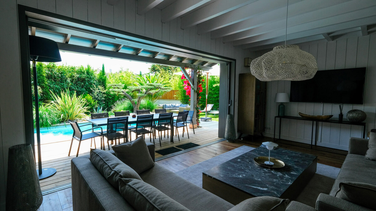 La pièce à vivre d’une superficie de 75 m², est un espace confortable et convivial qui s’ouvre sur le jardin paysagé, la terrasse et la piscine grâce à de grandes baies vitrées à galandage.