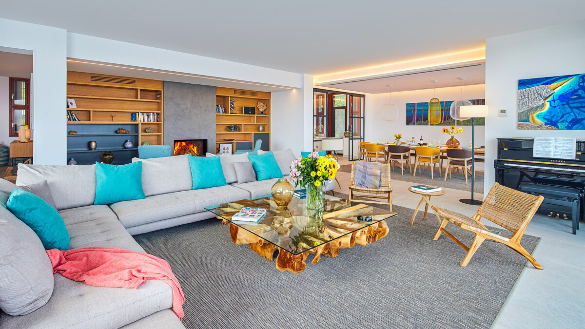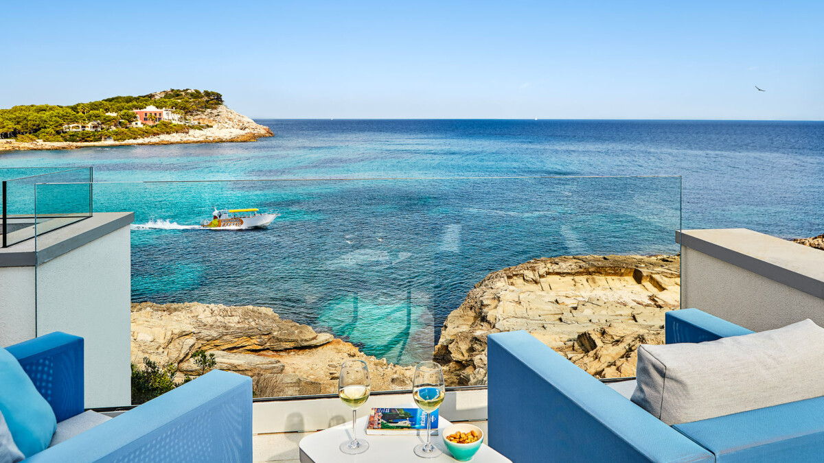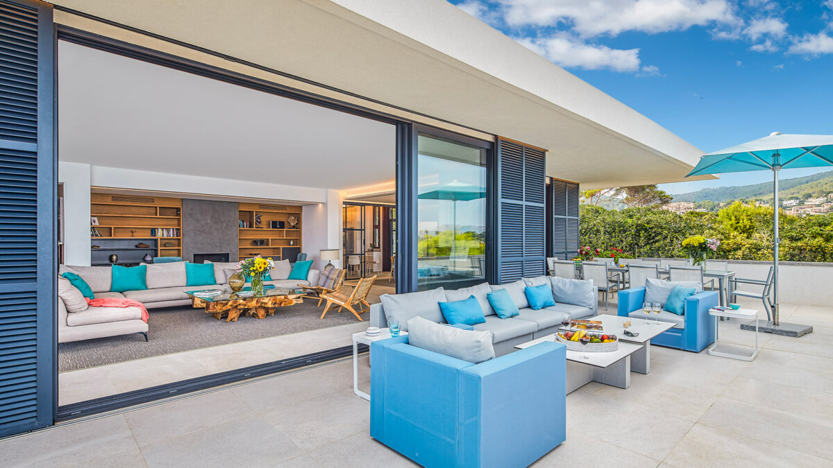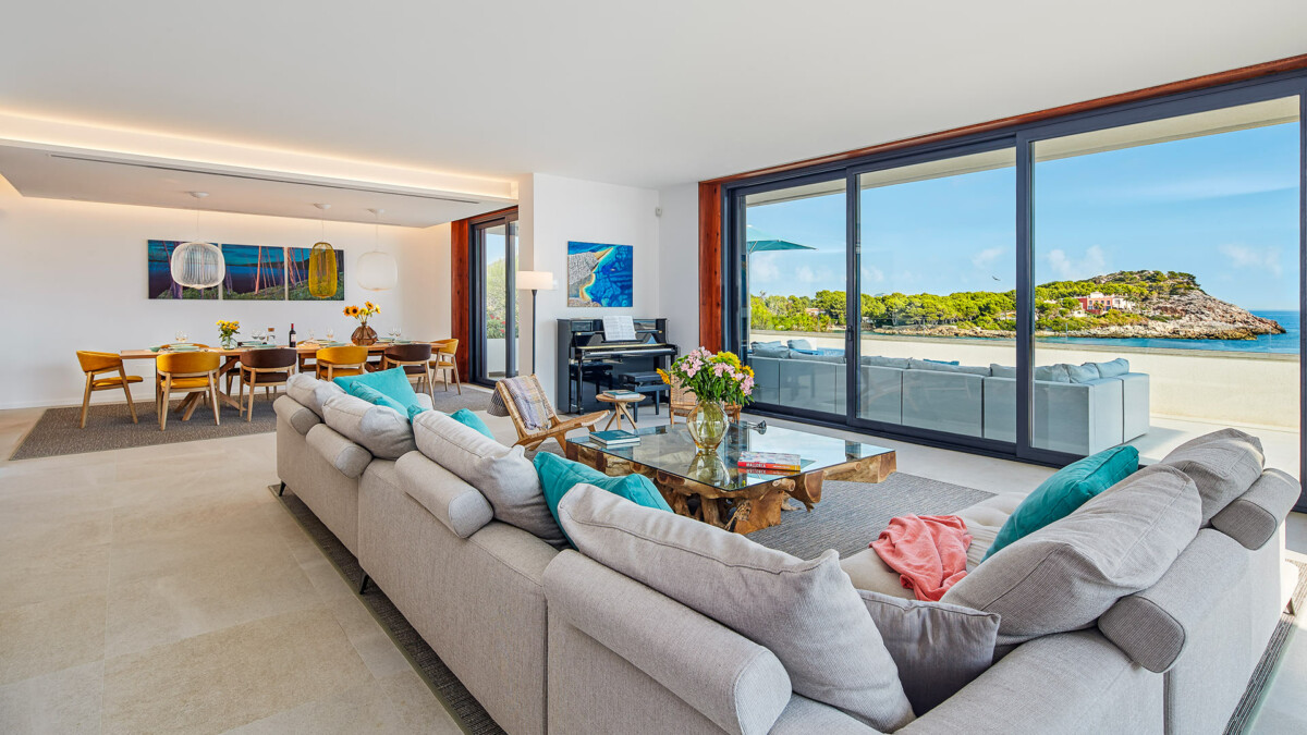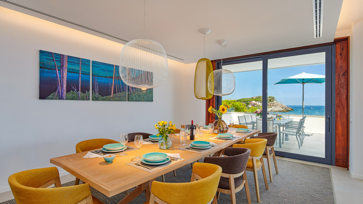 Dans le salon il y a une grande cheminée et dans la salle à manger, plus près de la cuisine récemment rénovée, on trouve une grande table à manger. Les chambres se trouvent au rez-de-chaussée et à l’étage inférieur, toutes ont de grandes fenêtres qui offrent une vue incroyable sur la mer des Baléares.