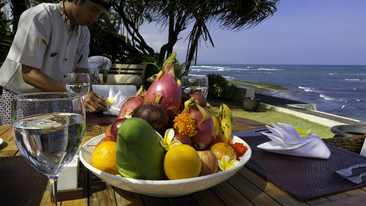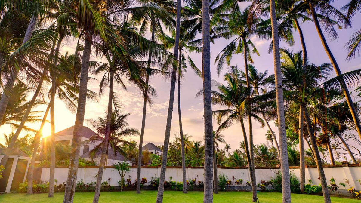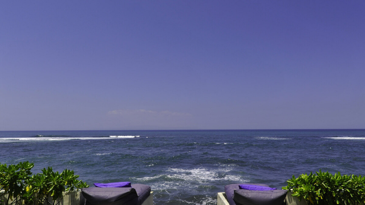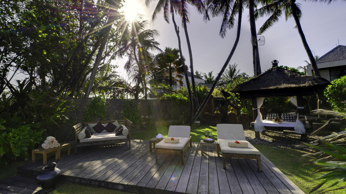 A paved pathway leads to a sliding door that gives access to 13 metres of beachfront with a wooden deck and wooden stairs leading to the beach. This area is shared between guests staying in Villa Nataraja and the neighbouring Villa Raj. It is the perfect place to relax under the coconut palms or to watch the sunrise and sunset as it casts a magical and unique light over the cliffs of Nusa Penida.