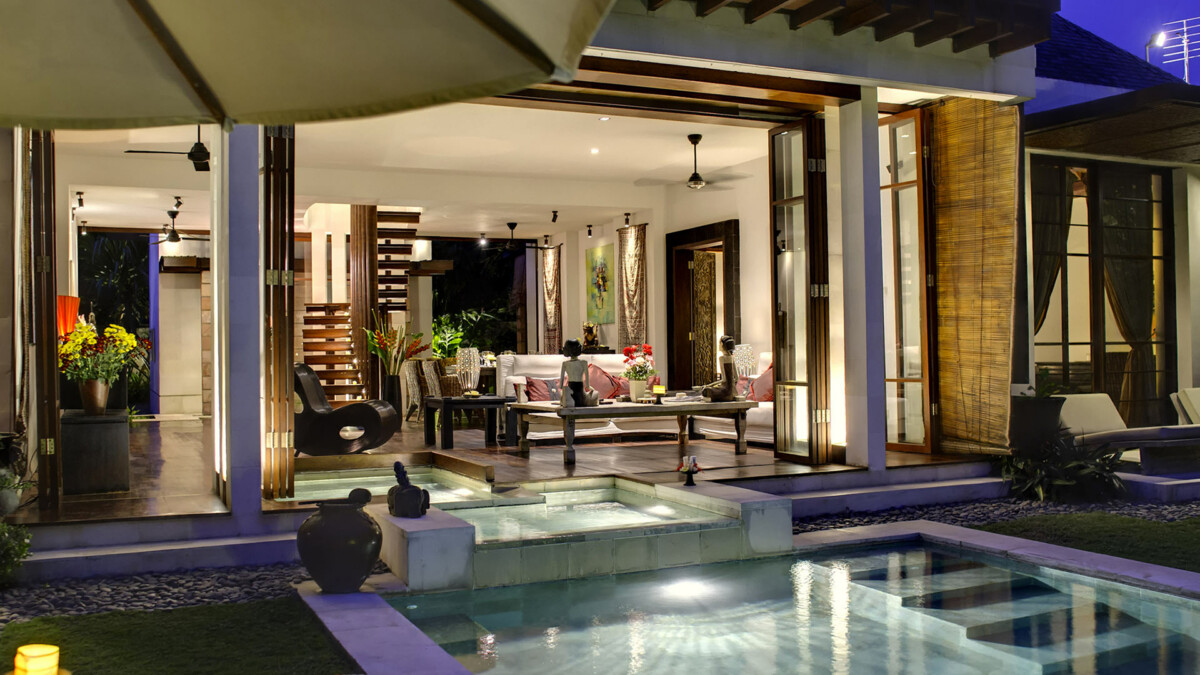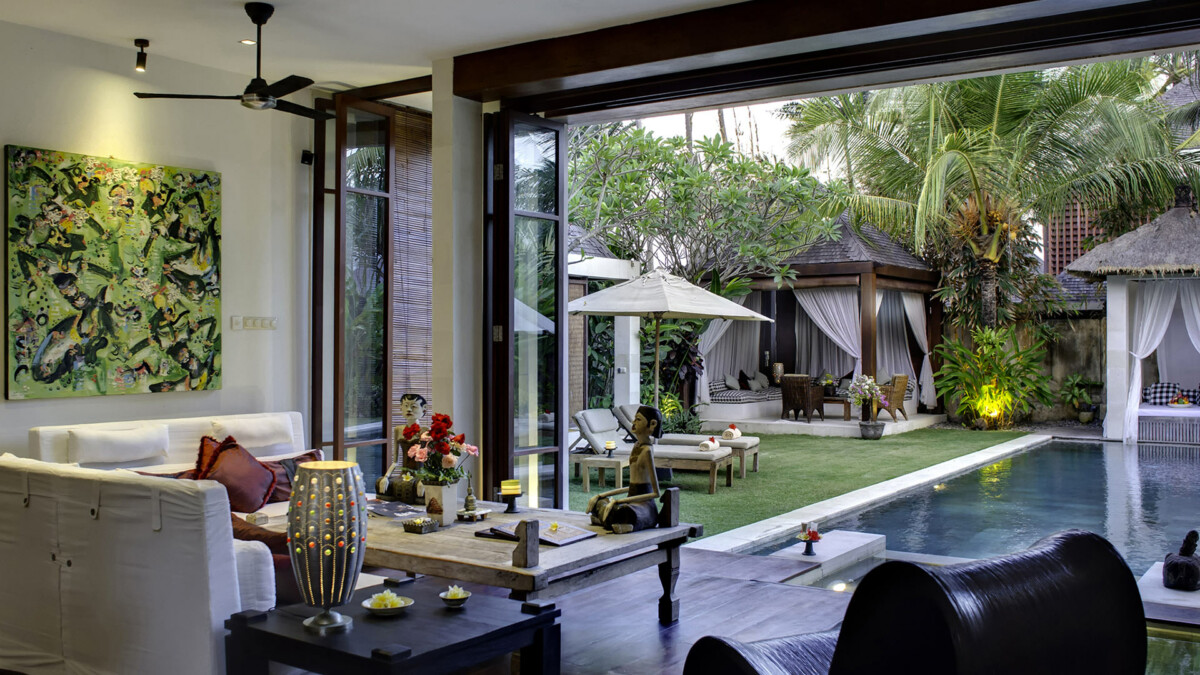 The living room of Villa Nataraja is semi-open and, like the dining room, adjoins the pool. Open at both ends, equipped with bamboo blinds and cooled by a ceiling fan, this room turns tropical living into pure bliss.