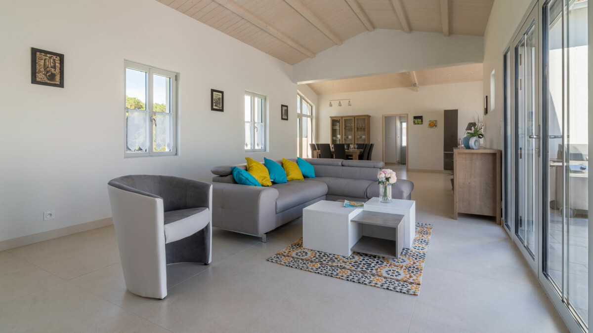The house, with an area of 150m², includes a living room with a kitchen opening onto a dining room, a lounge opening onto two terraces and a sunny garden.