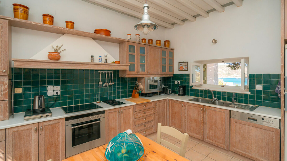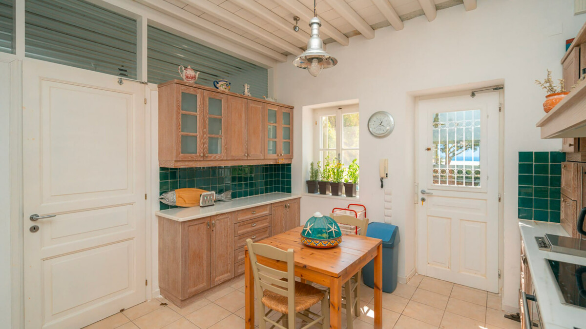 La villa Oleno dispose d’une cuisine entièrement équipée, avec une petite table, idéale pour les petits-déjeuners, d’une salle à manger, et d’un salon confortable avec télévision.