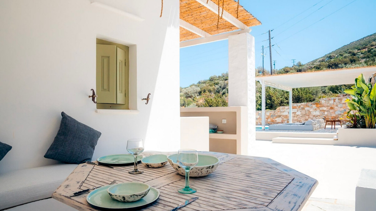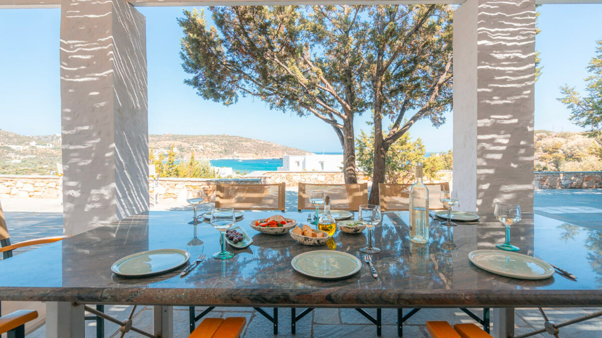 Un espace repas extérieur ombragé offre une grande table en granit pour 8/10 personnes, ainsi qu’un barbecue, avec vue sur la mer Égée.