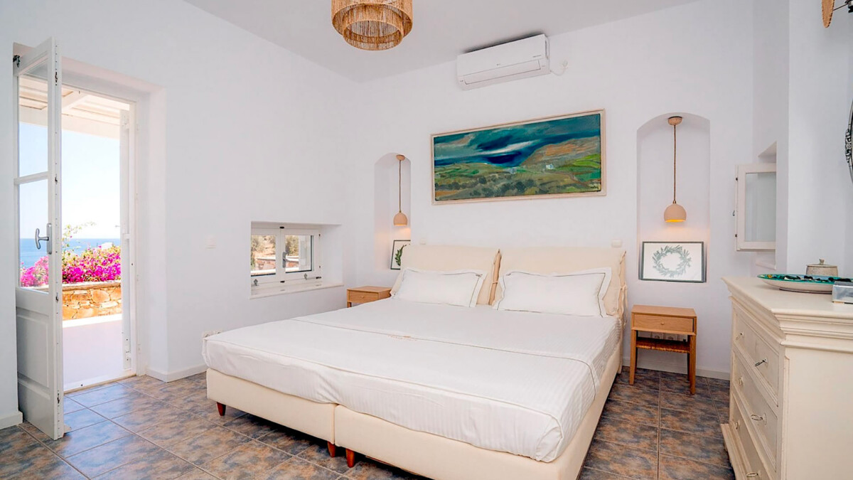 Chambre de maître, Rez-de-chaussée, vue sur la mer. La chambre propose 1 lit double 160 cm. Salle de bain à l’extérieur de la chambre, partagée, avec baignoire. WC séparés. La chambre inclut également : climatisation.
