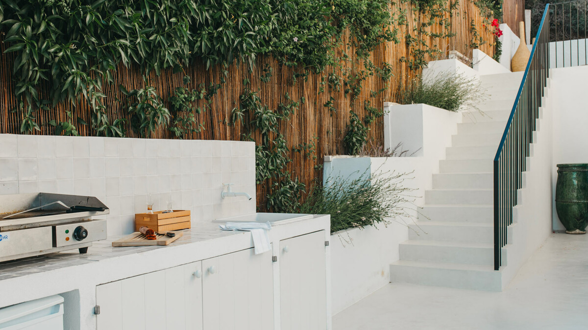 La vaste terrasse supérieure est l’endroit rêvé pour contempler les magnifiques couchers de soleil sur la mer. La terrasse principale, quant à elle, est dotée d’une pergola élégante, sous laquelle un espace lounge et une grande table à manger permettent de profiter de l’air libre tout en étant protégés du soleil. La cuisine extérieure équipée d’une plancha est parfaite pour préparer des repas en plein air.