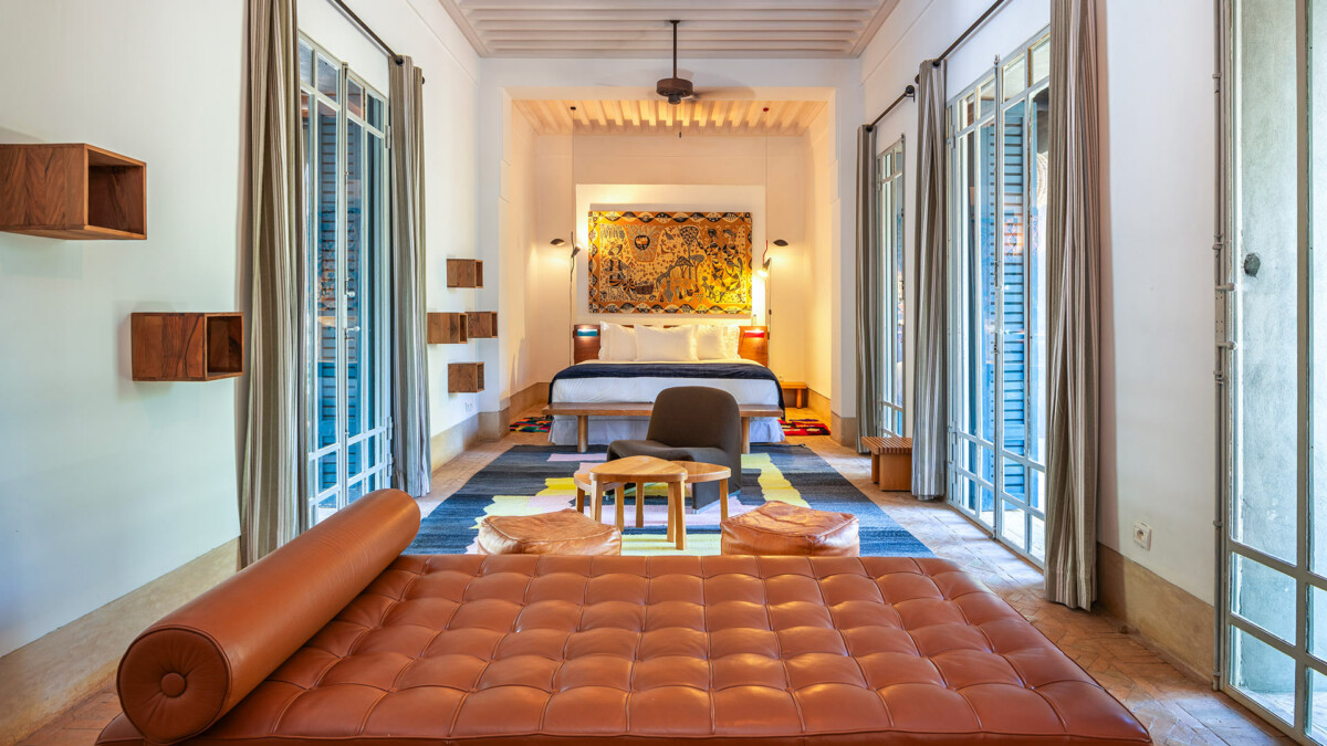 La décoration très raffinée mélange le mobilier de célèbres designers (Jean Prouvé, Florence Knoll, Charlotte Perriand, Pierre Paulin…) à des objets ethniques.
