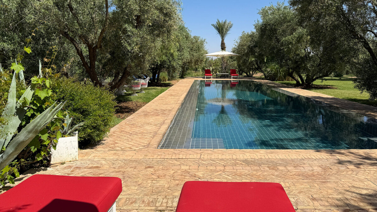 La piscine (100 m2) est chauffée en hiver sur demande. Vous trouverez au sein de la propriété de grandes terrasses avec un solarium en dénivelé offrent une vue panoramique sur l’Atlas.