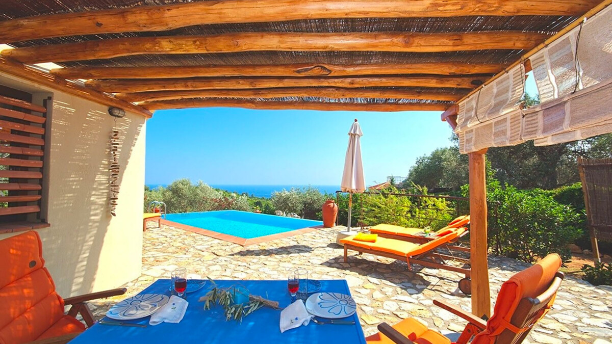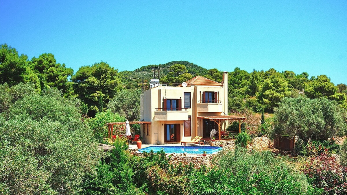 La villa se trouve à seulement dix minutes en voiture du port de Patitiri, à travers la forêt.