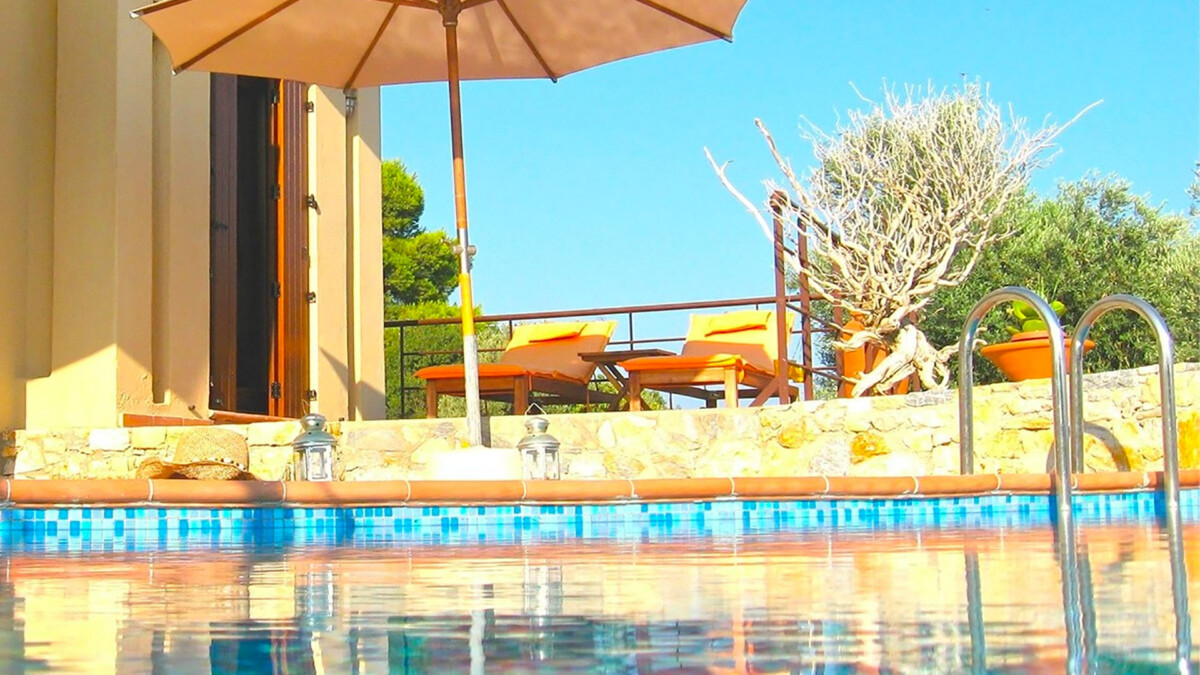 La piscine à débordement avec transats et la salle à manger à l’ombre de la pergola en bois sont idéales pour des journées précieuses et relaxantes dans le confort même de cette villa privée.