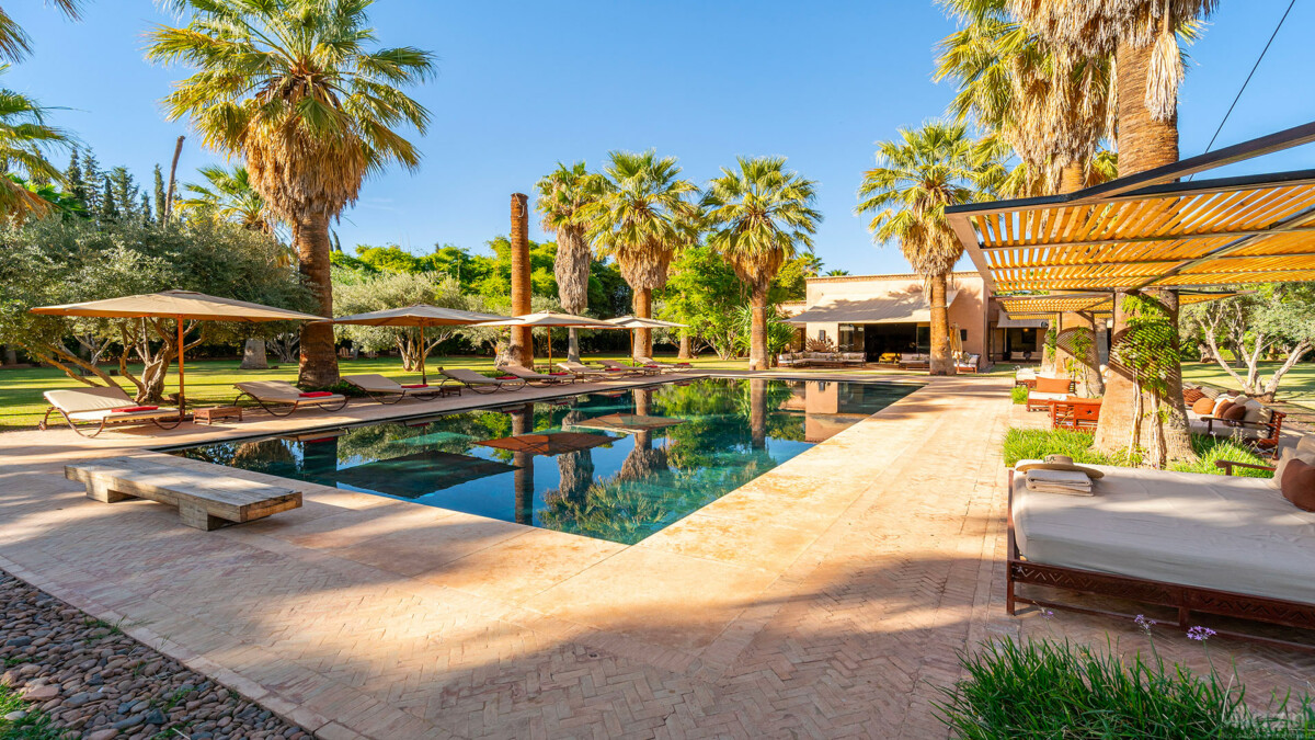 Le parc est planté de dizaines de palmiers énormes, dont certains ont plus d’un siècle, et au milieu se trouve la grande piscine à côté du salon sous la pergola.