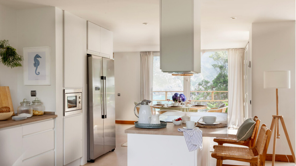 L’intérieur de la villa se distingue par ses larges fenêtres qui cadrent magnifiquement la vue sur la mer et les forêts. Un salon élégant, avec une salle à manger adjacente, dispose d’une cheminée, créant une ambiance chaleureuse. La cuisine moderne est entièrement équipée, incluant une machine à café Nespresso et un mixeur.