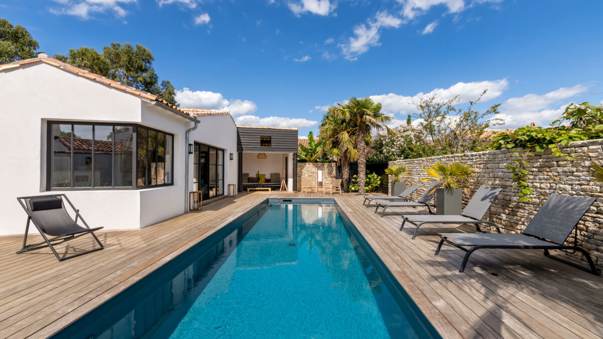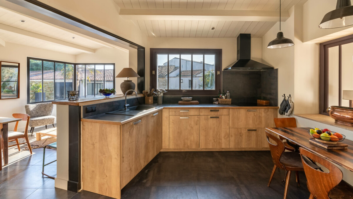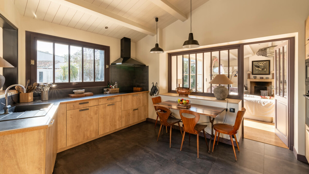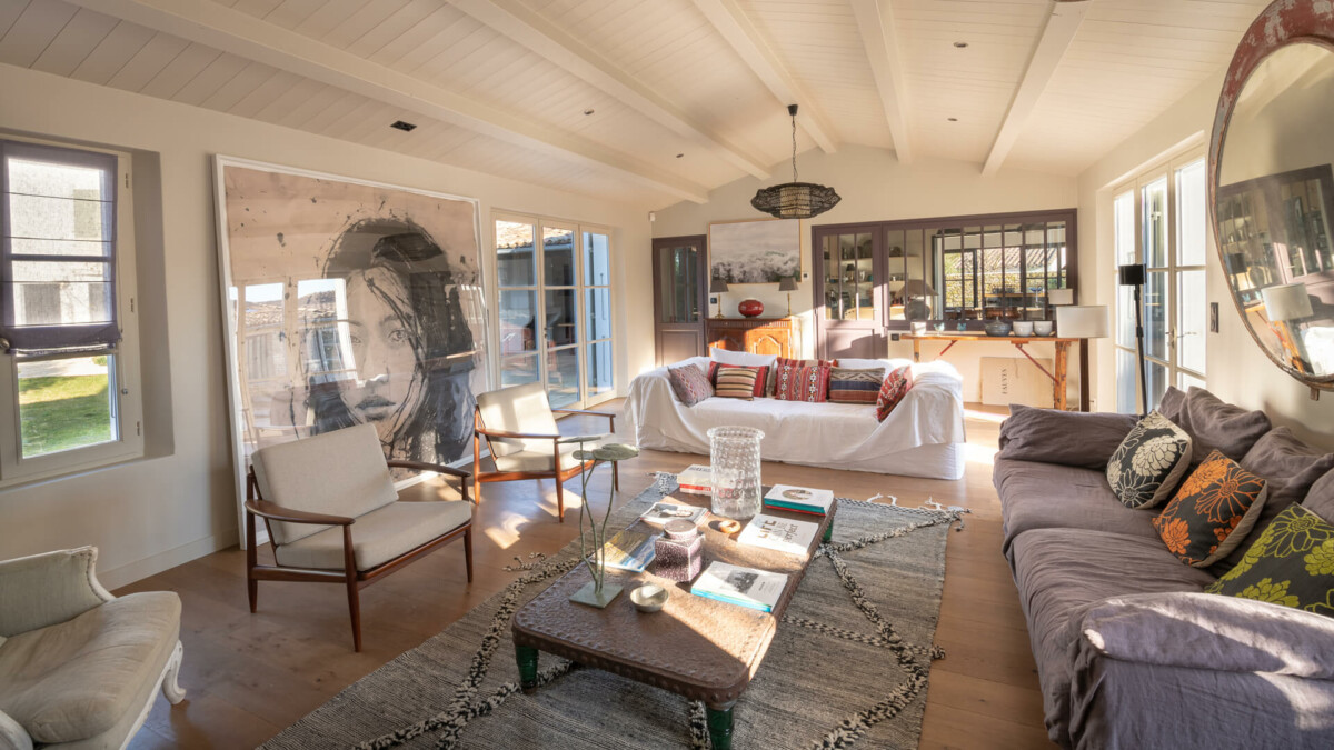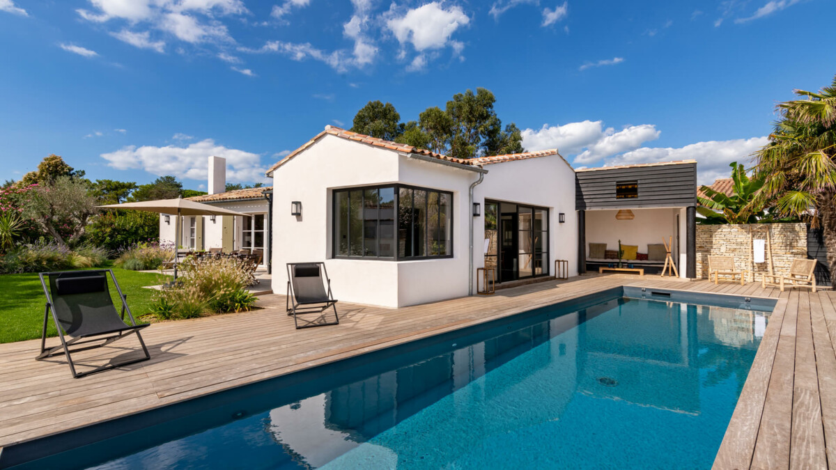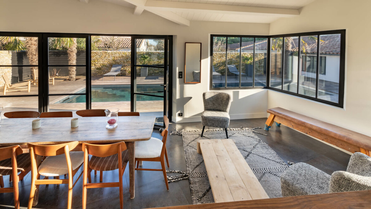 La Villa Phénix offre 260 m2 d’espace intérieur généreux, aménagé dans des tons clairs et foncés pour créer une atmosphère à la fois chic et très décontractée, à l’image de l’île de Ré.