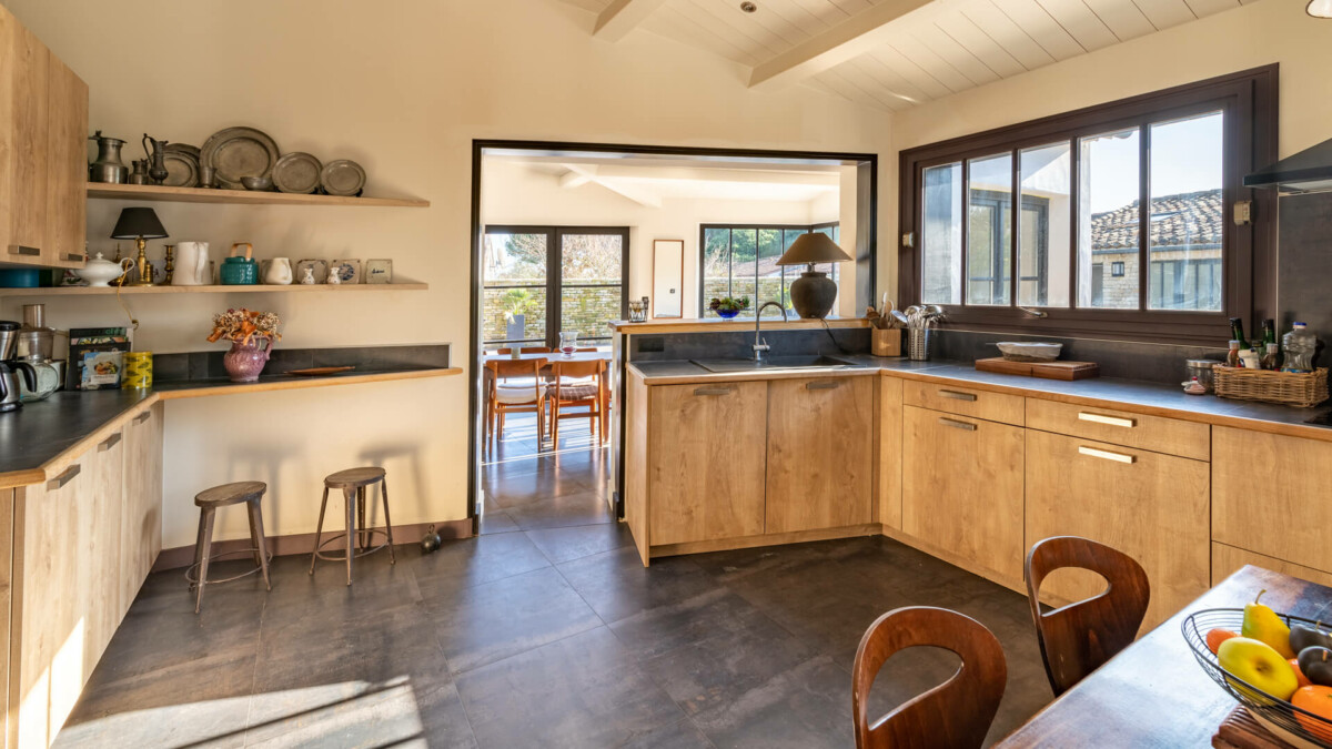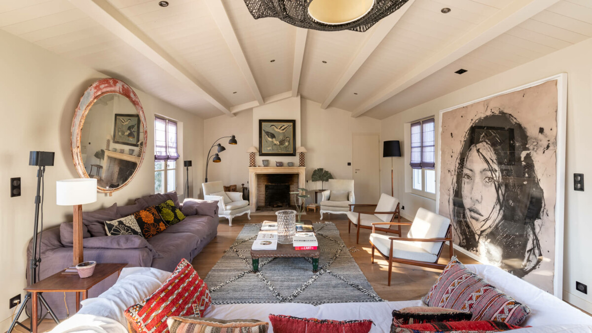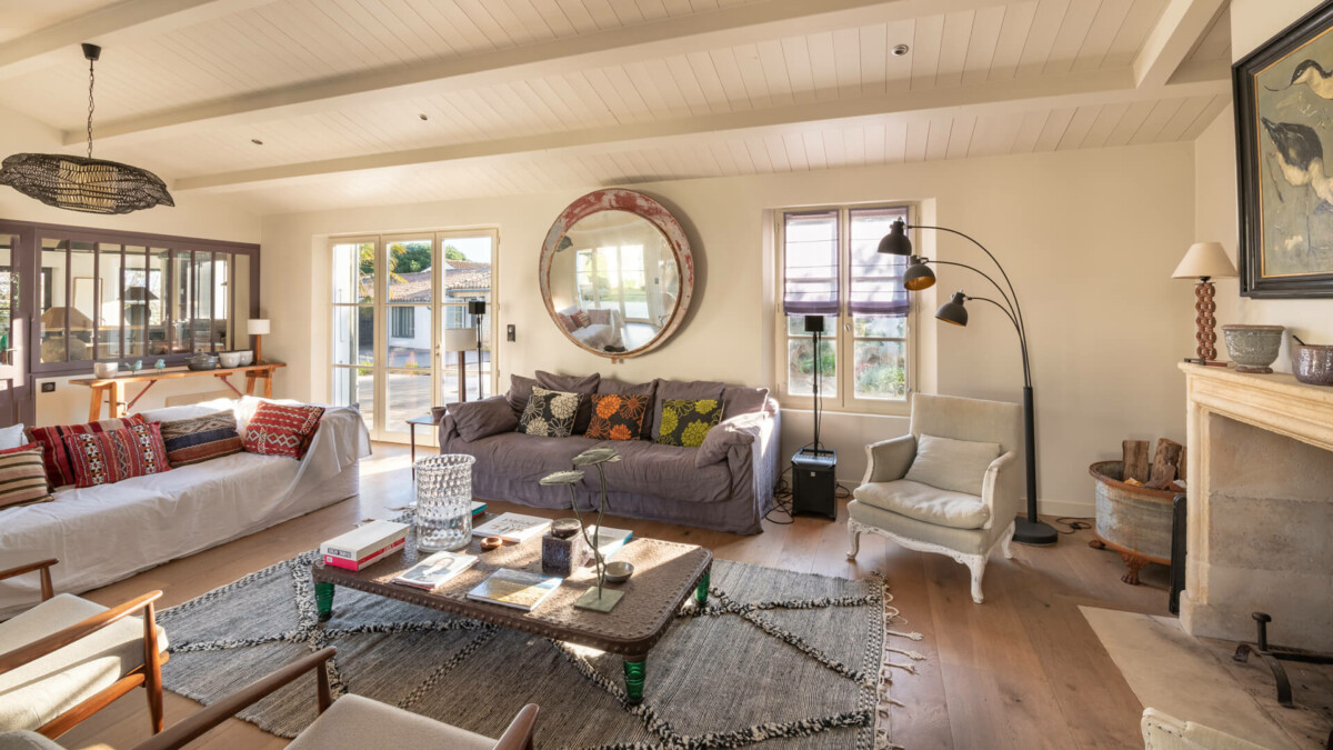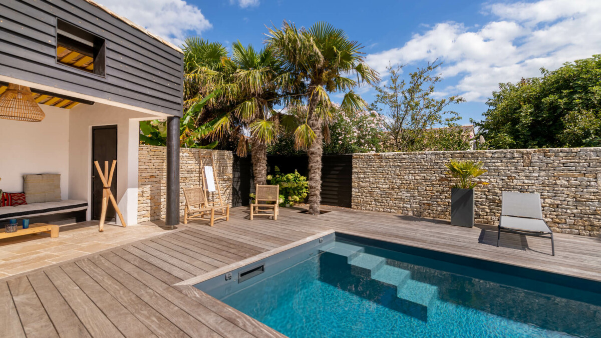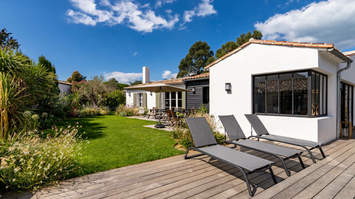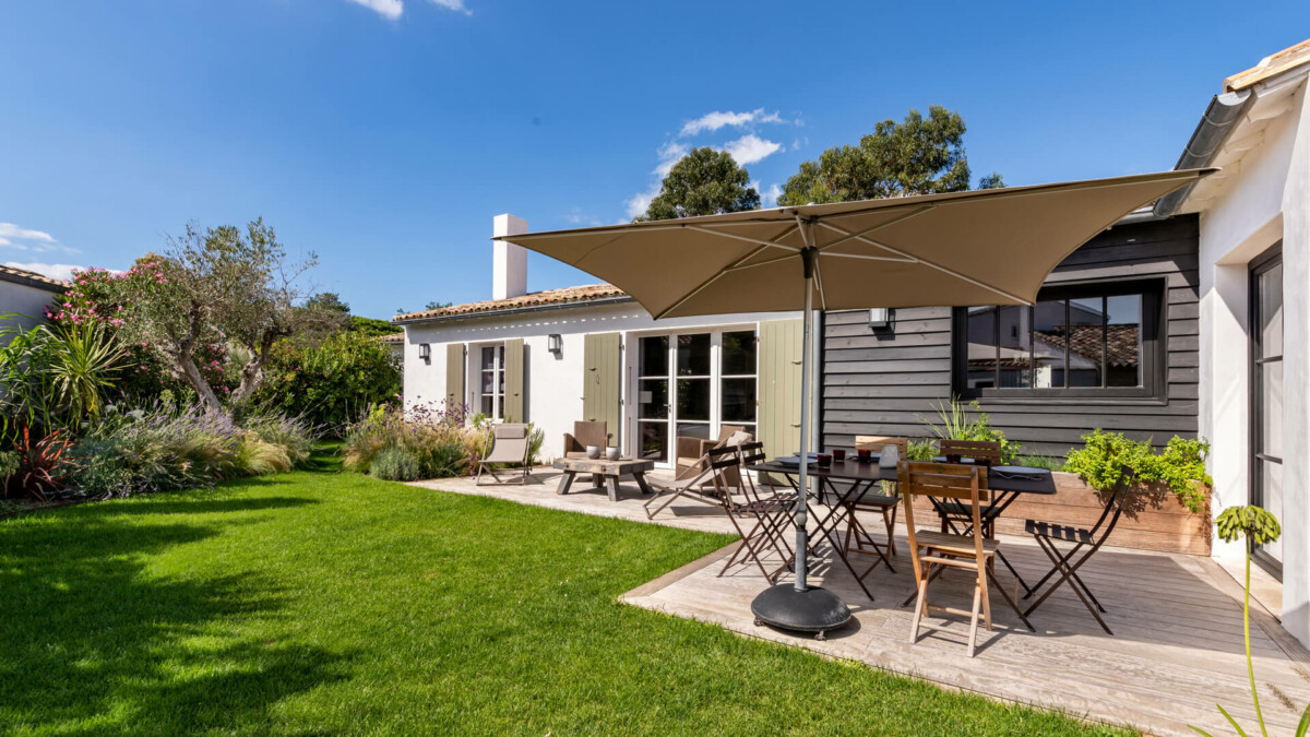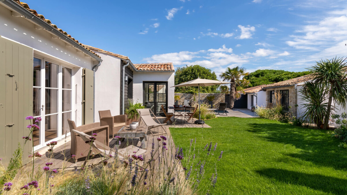 La Villa Phénix offre 260 m2 d’espace intérieur généreux, aménagé dans des tons clairs et foncés pour créer une atmosphère à la fois chic et très décontractée, à l’image de l’île de Ré.