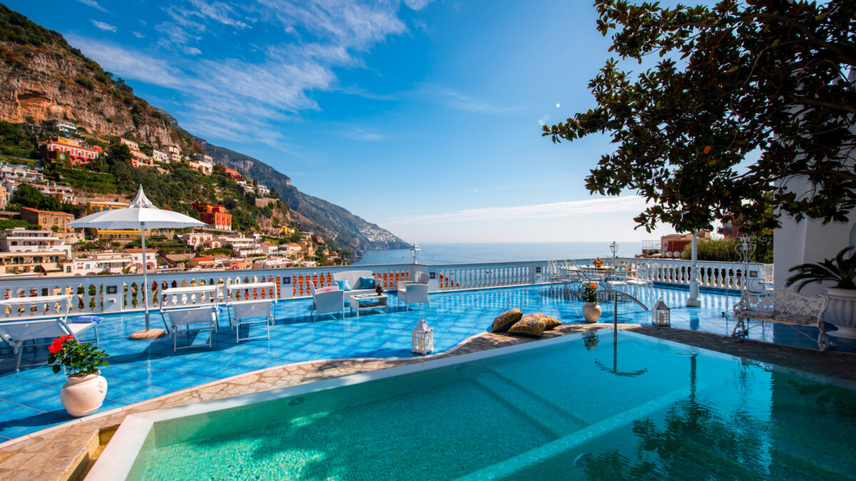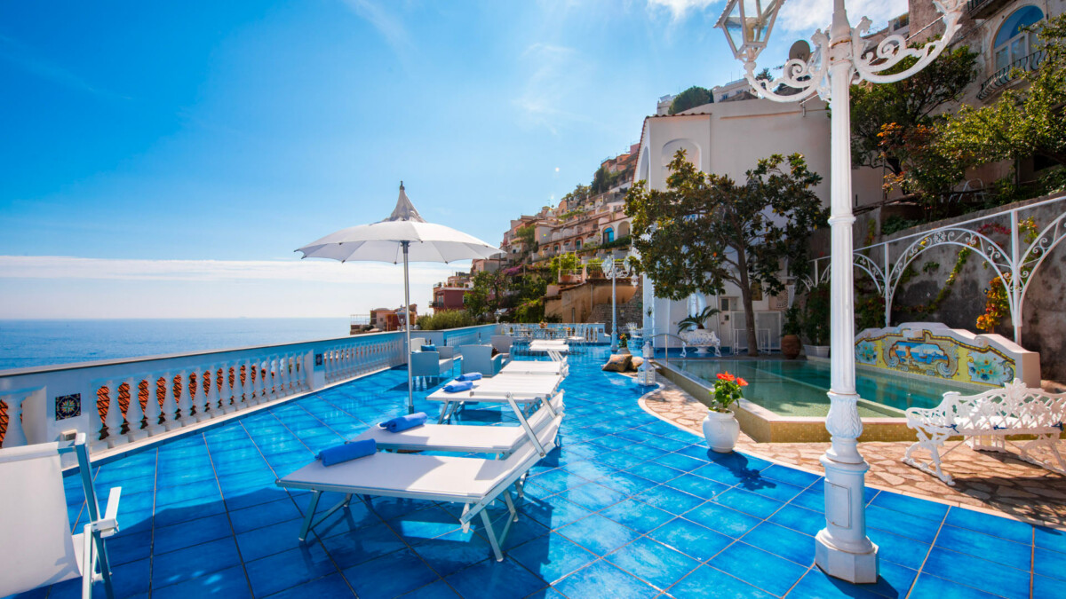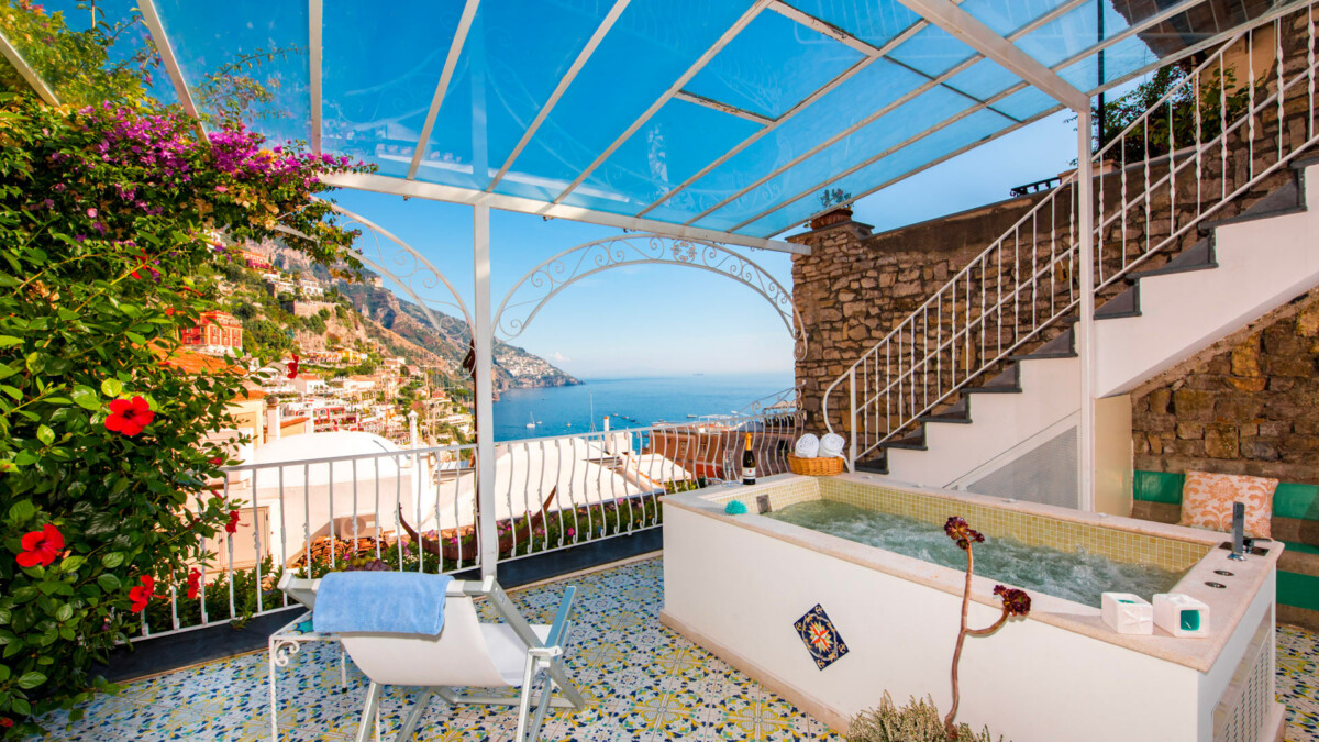 La grande terrasse autour de la piscine a une superficie d’environ 200 mètres carrés et est équipée d’une grande table et de chaises pour 12 personnes, de bancs, de chaises longues et de parasols. De la terrasse, vous aurez une vue à couper le souffle sur la mer et sur Positano.