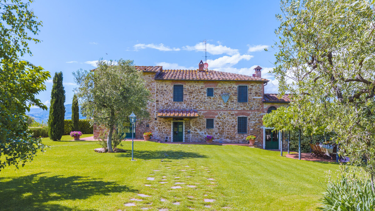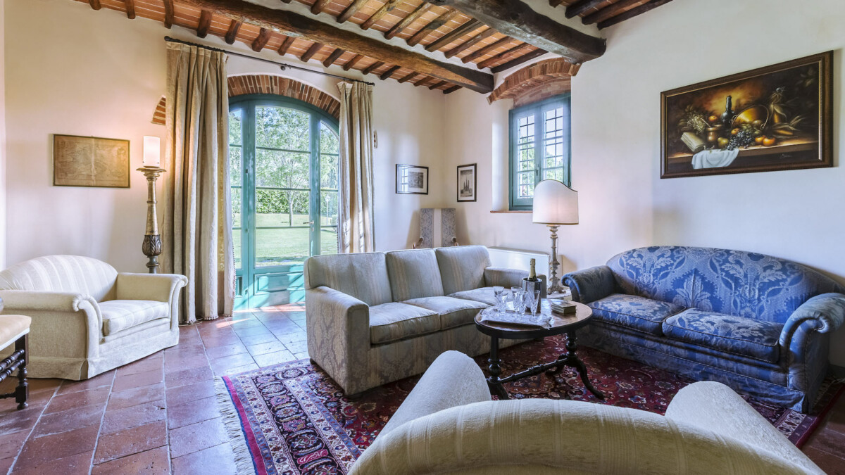 Les murs extérieurs sont recouverts de pierre locale typique présente sur presque toutes les maisons environnantes, conservant l’aspect original du bâtiment quand il a été construit il y a plus de 200 ans. La villa donne sur la campagne toscane typique – collines et oliviers, des bois de châtaigniers et de chênes – tous plongés dans une oasis de silence.