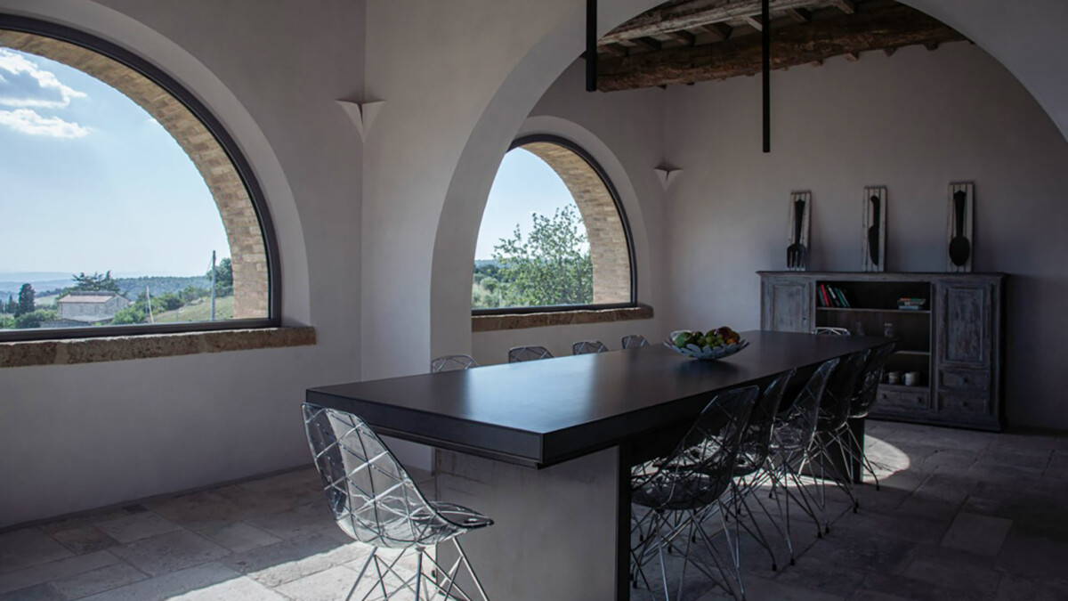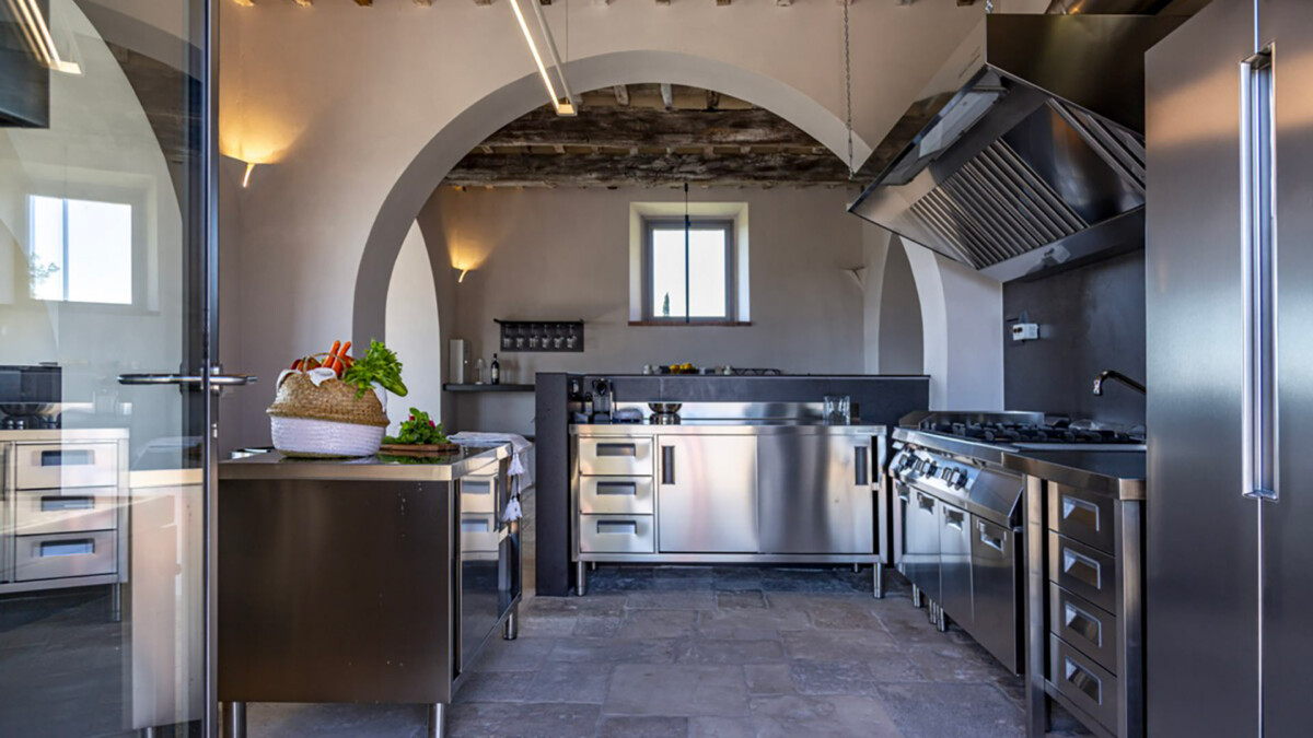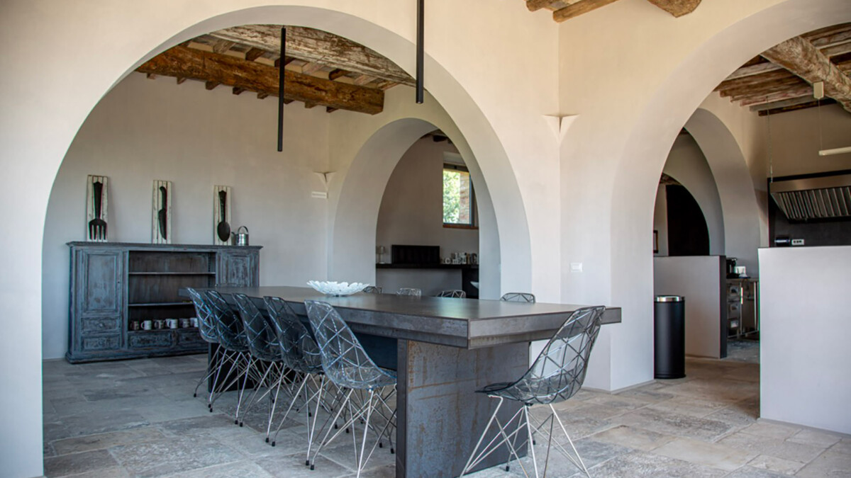The villa welcomes you in a setting where the ancient and the modern coexist wonderfully. The ground floor opens onto a vast living room with a warm fireplace, perfect for cosy evenings. The kitchen is fully fitted in stainless steel and opens gracefully onto a dining area with a long table ideal for sharing memorable meals with family and friends.