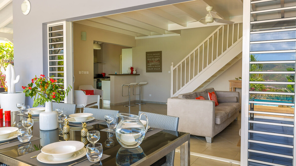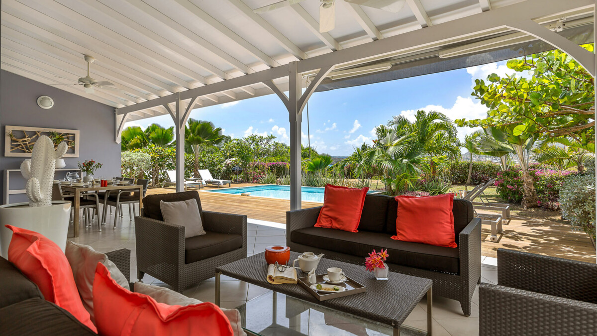 Le spacieux salon vous garantira tout le confort recherché avec son canapé, sa TV et ses larges baies vitrées qui s’ouvrent sur votre jardin et offre une vue splendide sur l’anse Balahou et ses eaux turquoises.