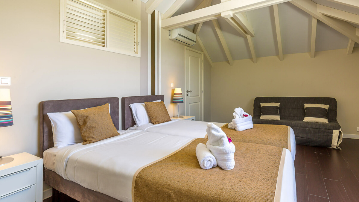 Chambre 4 : 2 lits simples modulable en 1 grand lit double avec dressing et salle de bain wc privés, dispose également d’un canapé lit convertible 2 places.