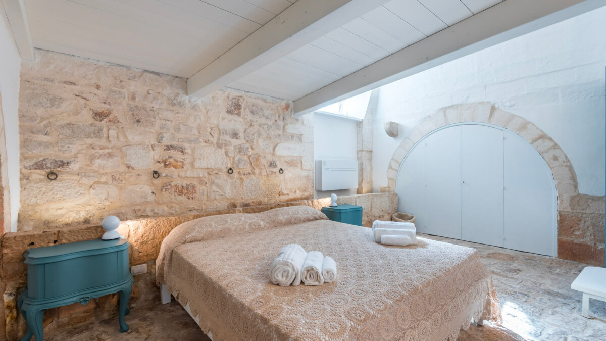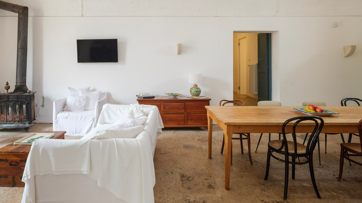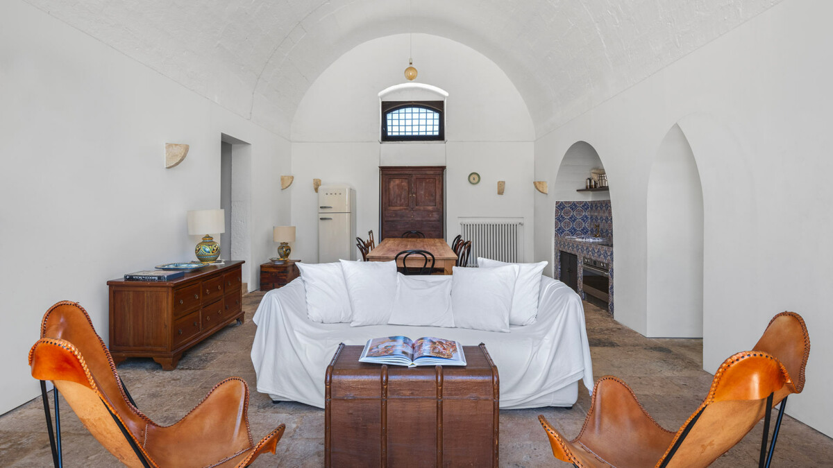 L’ancienne “carrittaria” (chambre charrette) a été judicieusement préservée et est devenue un vaste espace de vie disposant d’une salle à manger, d’une cuisine équipée et d’un salon. Les trois chambres ont de hauts plafonds de pierres et disposent chacune de salles de bain indépendantes. La première chambre comporte un lit double et un canapé-lit, la seconde deux lits doubles et la troisième possède un lit double.